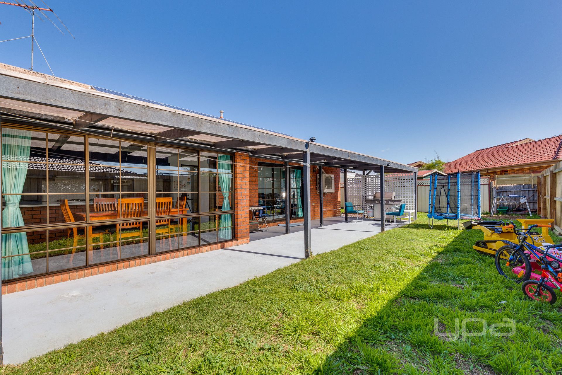 Outdoor entertainment area with pergola and decent size backyard.