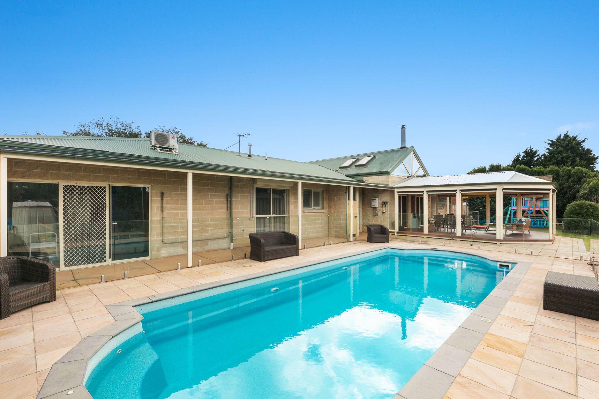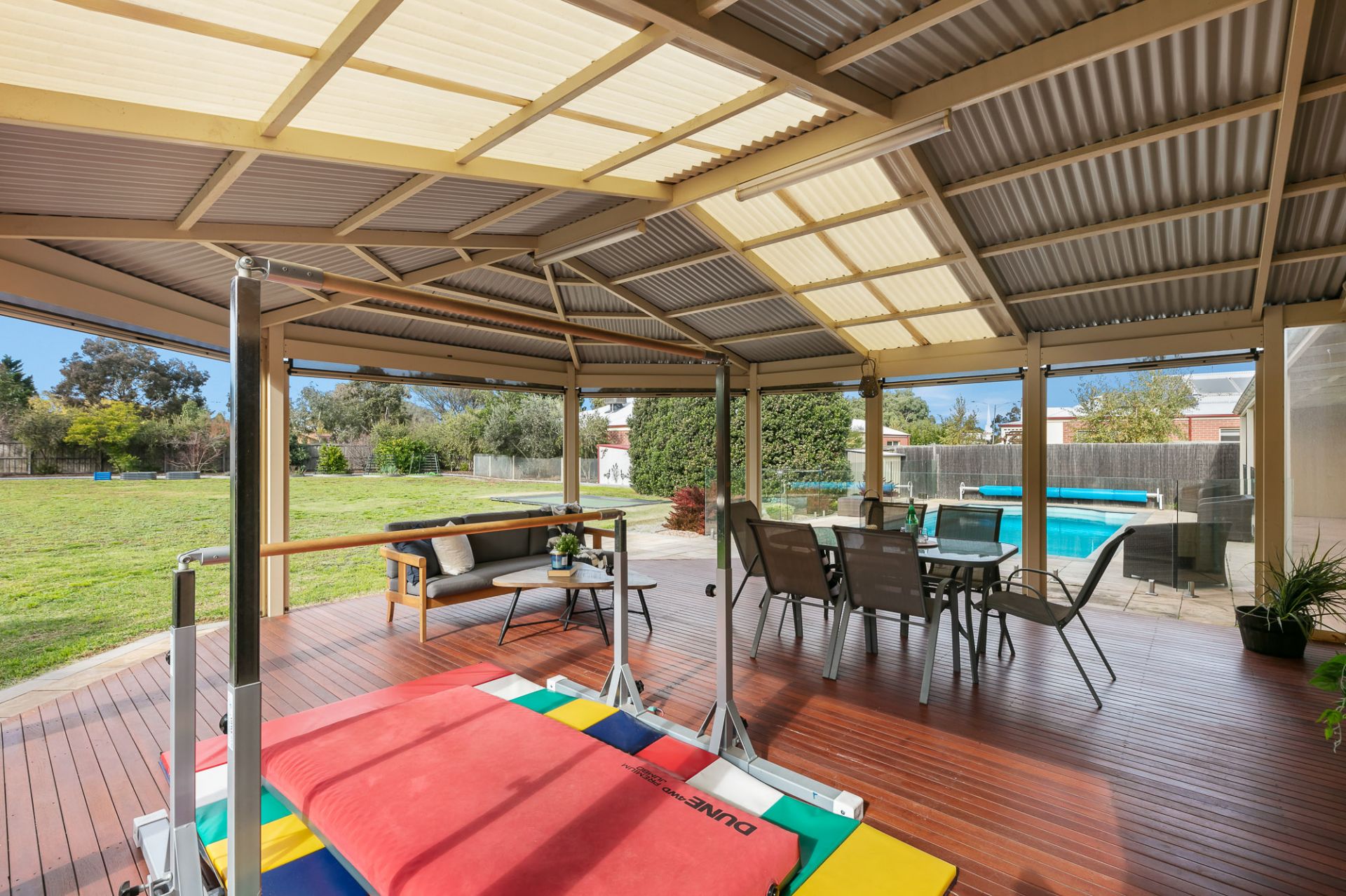 Step outdoors from the family room to a magnificent timber decked entertainment area with zip track blinds & then the exciting part for the kids; a large playground, in-ground trampoline, basketball ring & a gorgeous in-ground salt chlorinated - solar heated swimming pool.