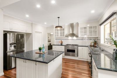 Formal lounge room, then the most exhilarating part of the home a gigantic family/living & dining room sun drenched in natural light with your own rustic style bar overlooking the stunning kitchen with shiny granite benches.