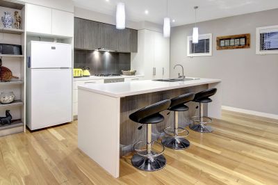 An island bench, quality cabinetry and stone bench tops feature in the gourmet kitchen which also features a Miele dishwasher