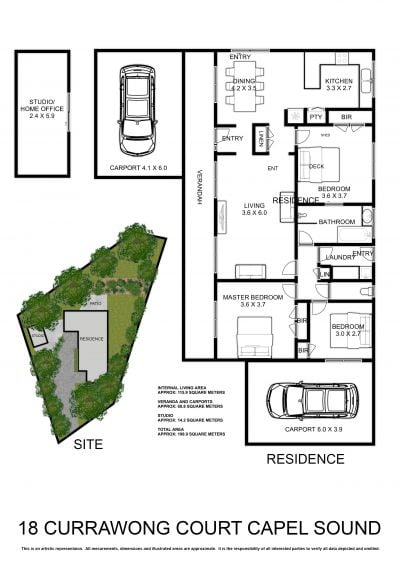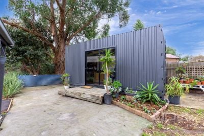 - Practical floor plan comprising three bedrooms, one bathroom and open concept kitchen living plus a separate detached bungalow (Portable) set up as a home office and gym.