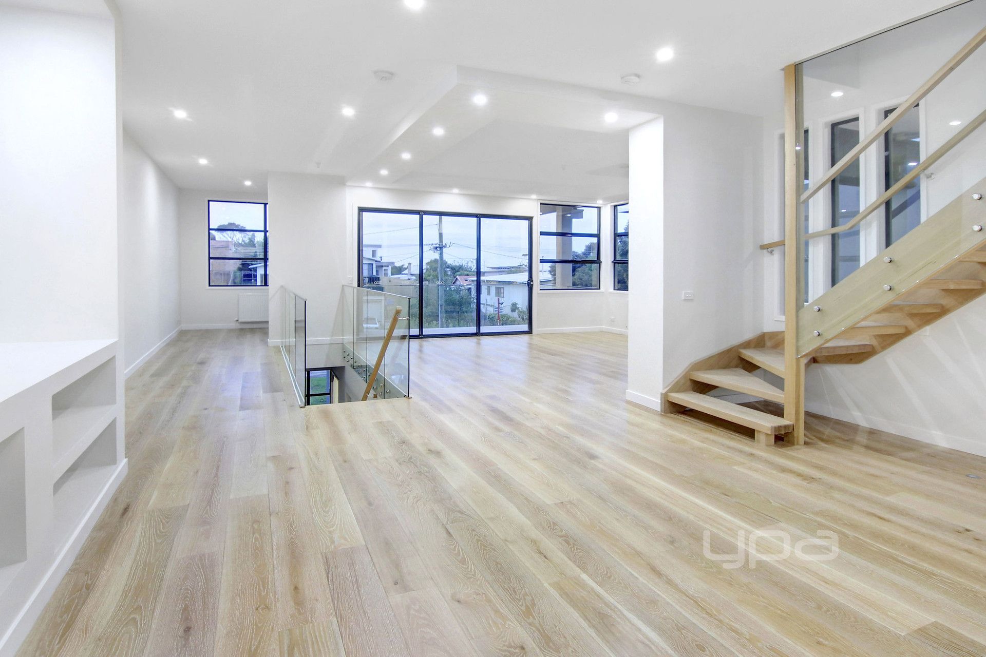 Timber & glass staircase boasting a sleek open tread design