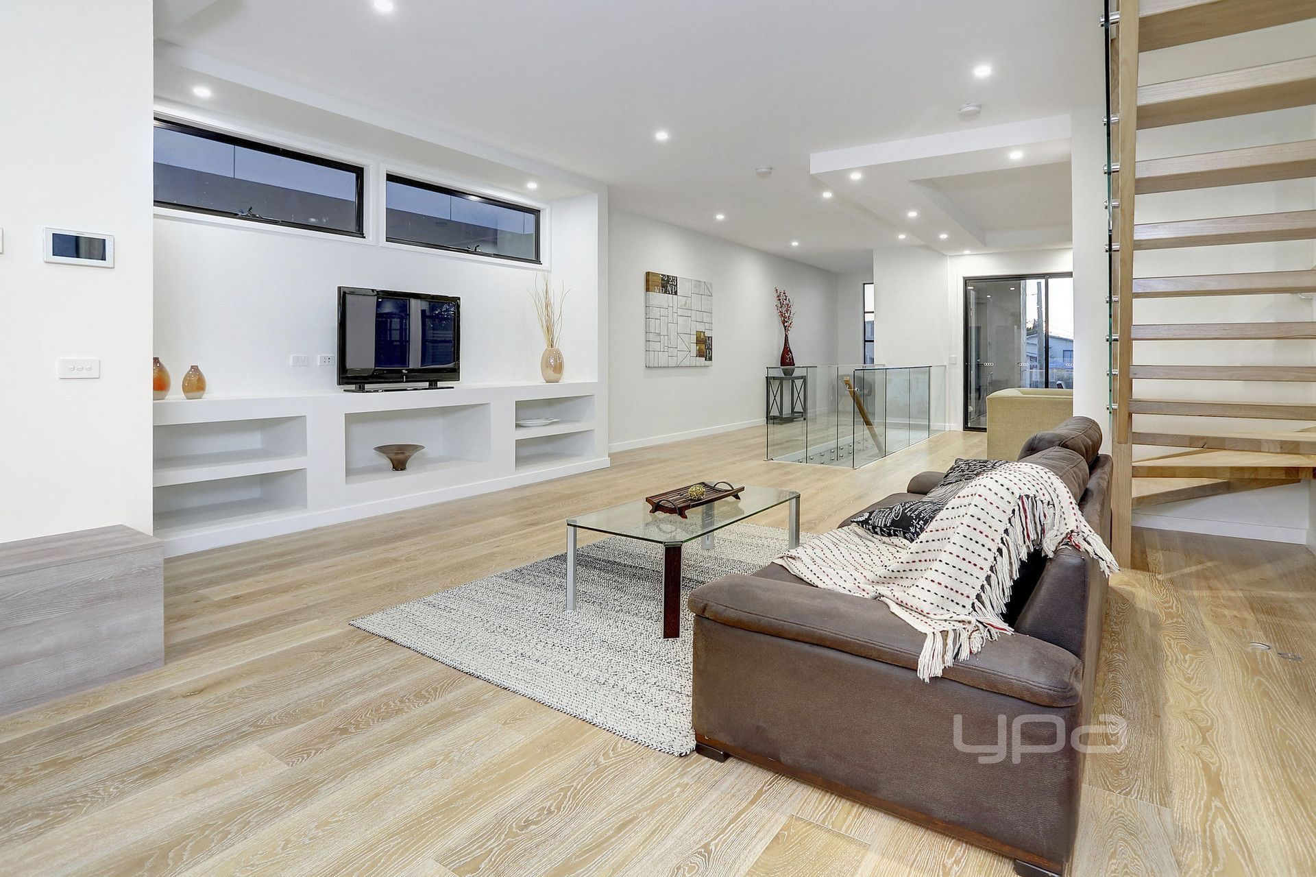 Timber & glass staircase boasting a sleek open tread design