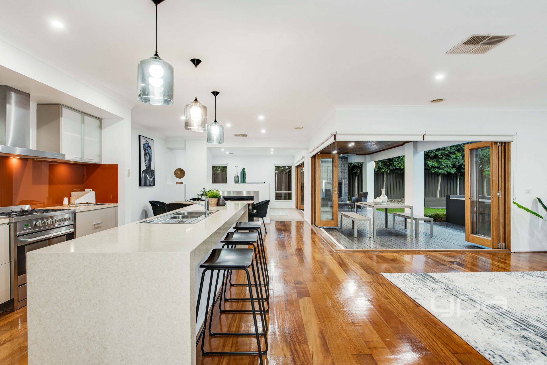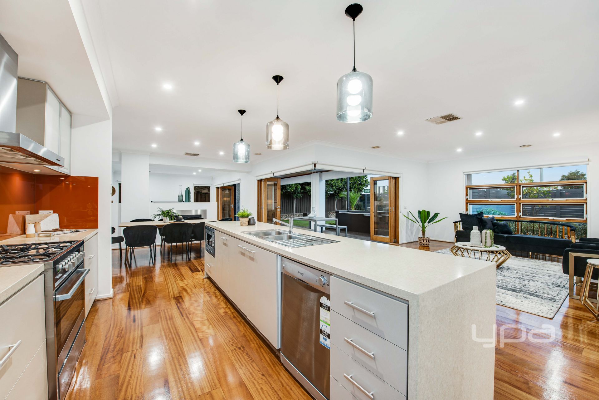 -Stunning kitchen with stone bench tops 900mm appliances, built in microwave and plenty of cupboard space