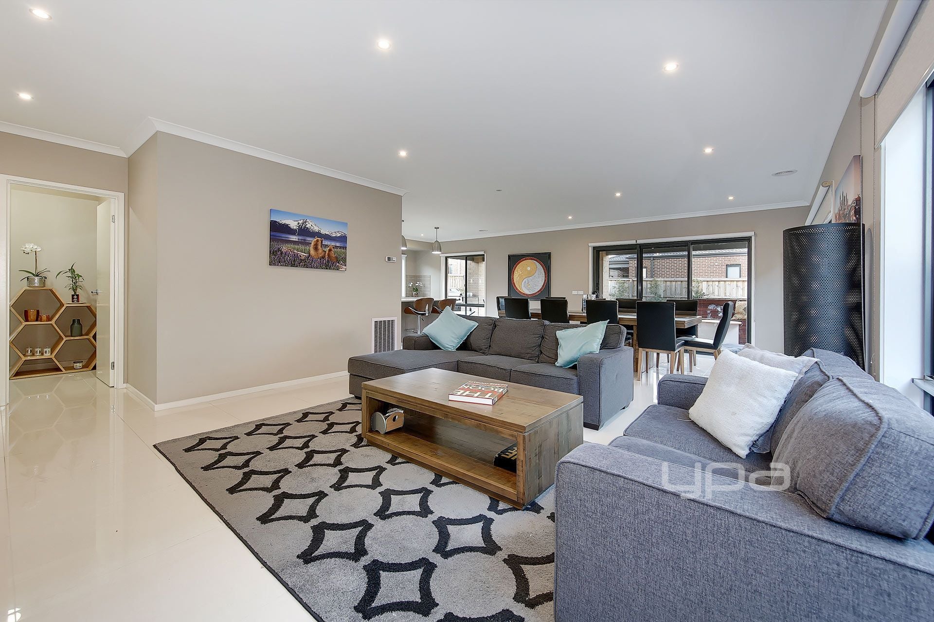 Open plan living, kitchen, dining area with porcelain tiled flooring leading to the outdoor alfresco and barbecue area