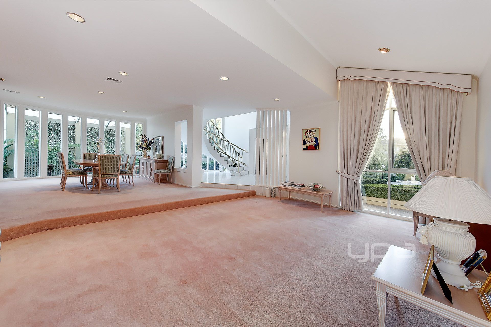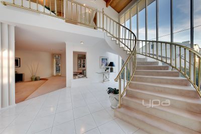 The home is unrivalled in architectural innovation! As soon as you walk through the door you will be captivated by the vast entrance showcasing high elaborate cathedral ceilings resplendent with rich timber work, to the wide suspended slab spiral staircase, decorative cornices and curved walls.