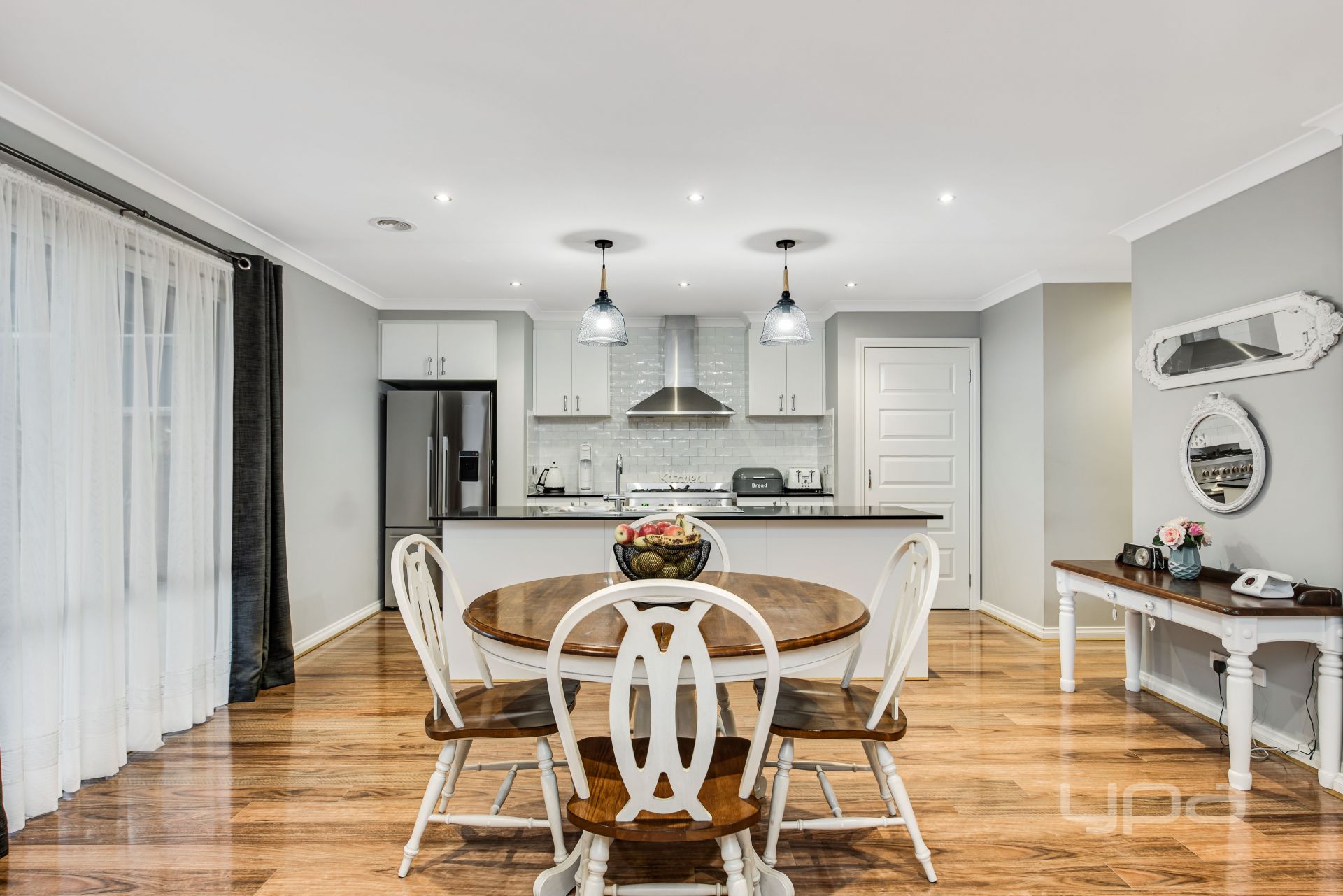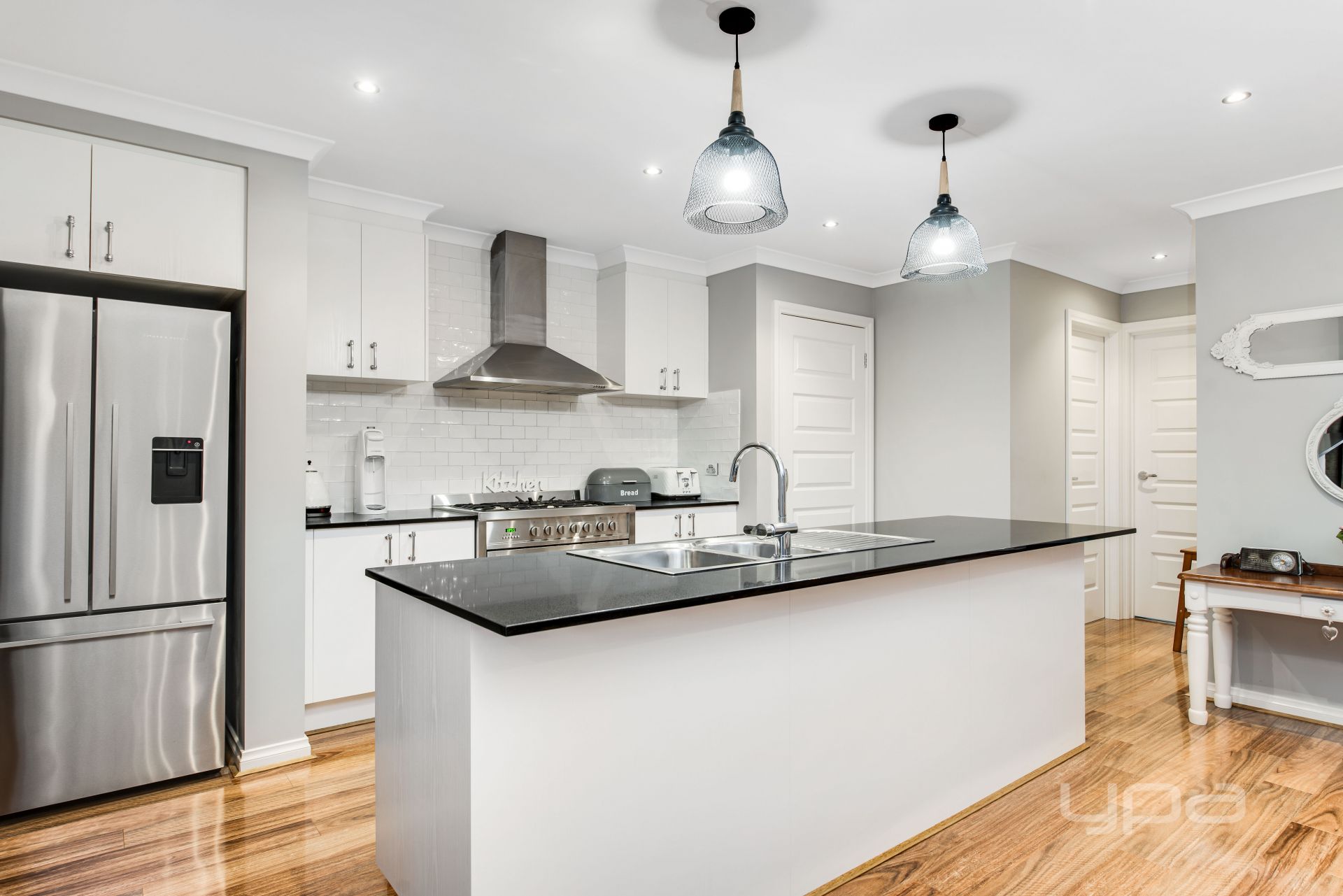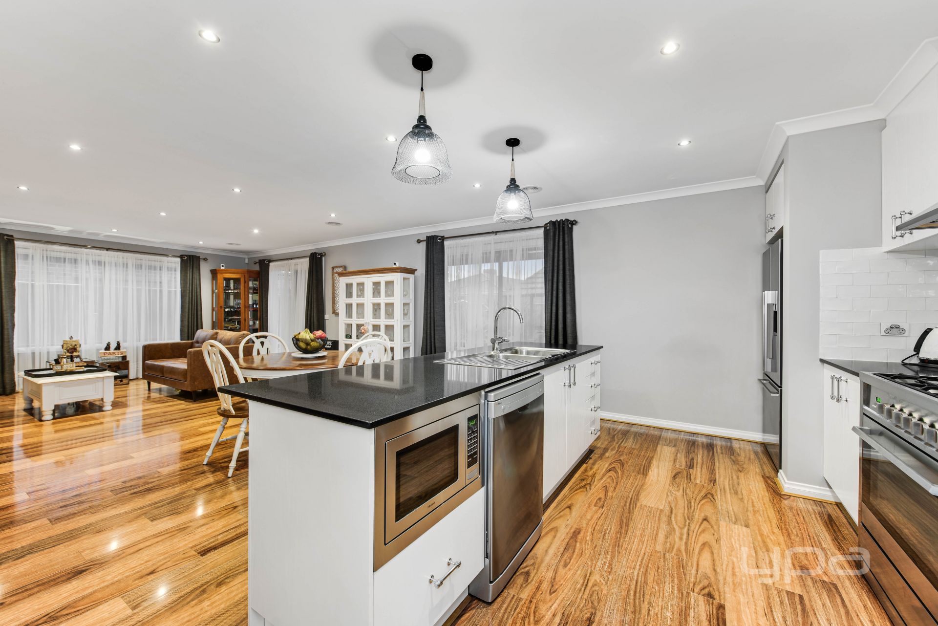Instantly impressive from the moment you enter with a lengthy wide hallway, and polished upmarket laminate flooring, flowing to the heart of the home, a bright gourmet kitchen with sleek black stone benchtops, subway tiled splash back, s/s appliances, integrated dishwasher & microwave, WIP, and island overlooking the spacious open plan living/meals area. The first level also comprises of a separate formal lounge, powder room, full-sized laundry and external access to the backyard.
