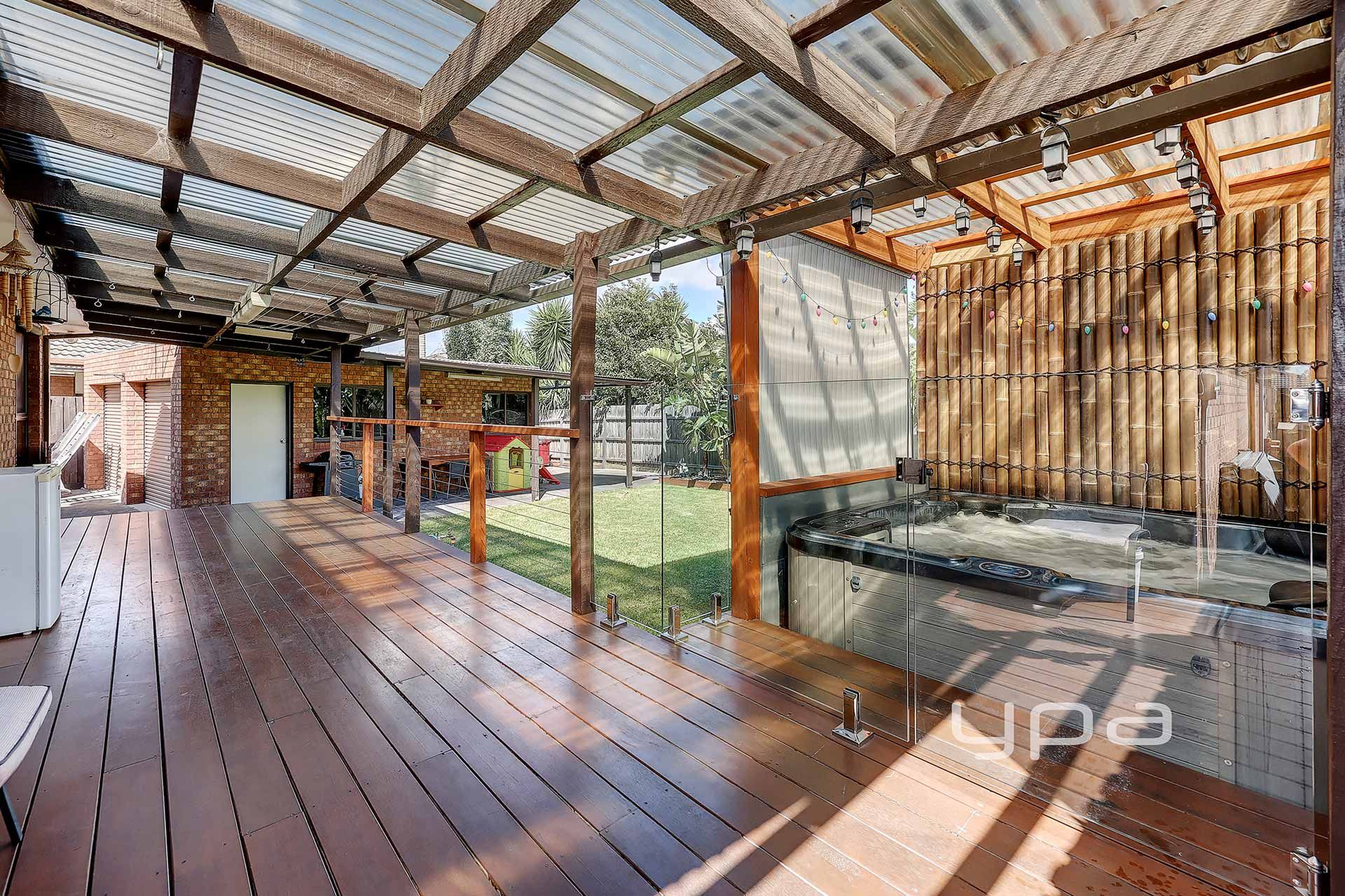 • Opening out from the dining area, you're greeted with a beautifully landscaped, private rear garden, lavished with exquisite Bird of Paradise flora and comprising of a large undercover, raised timber deck pergola, alongside an enclosed 8 person spa with bamboo screening and feature lighting, radiating a feeling of relaxation.