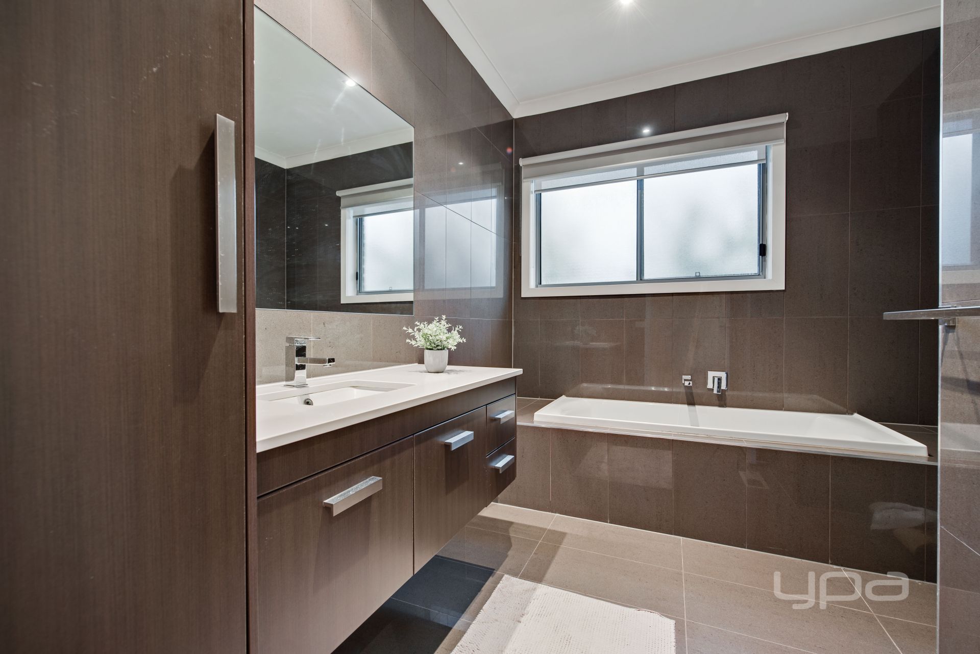 • Modern central bathroom, tiled floor to ceiling