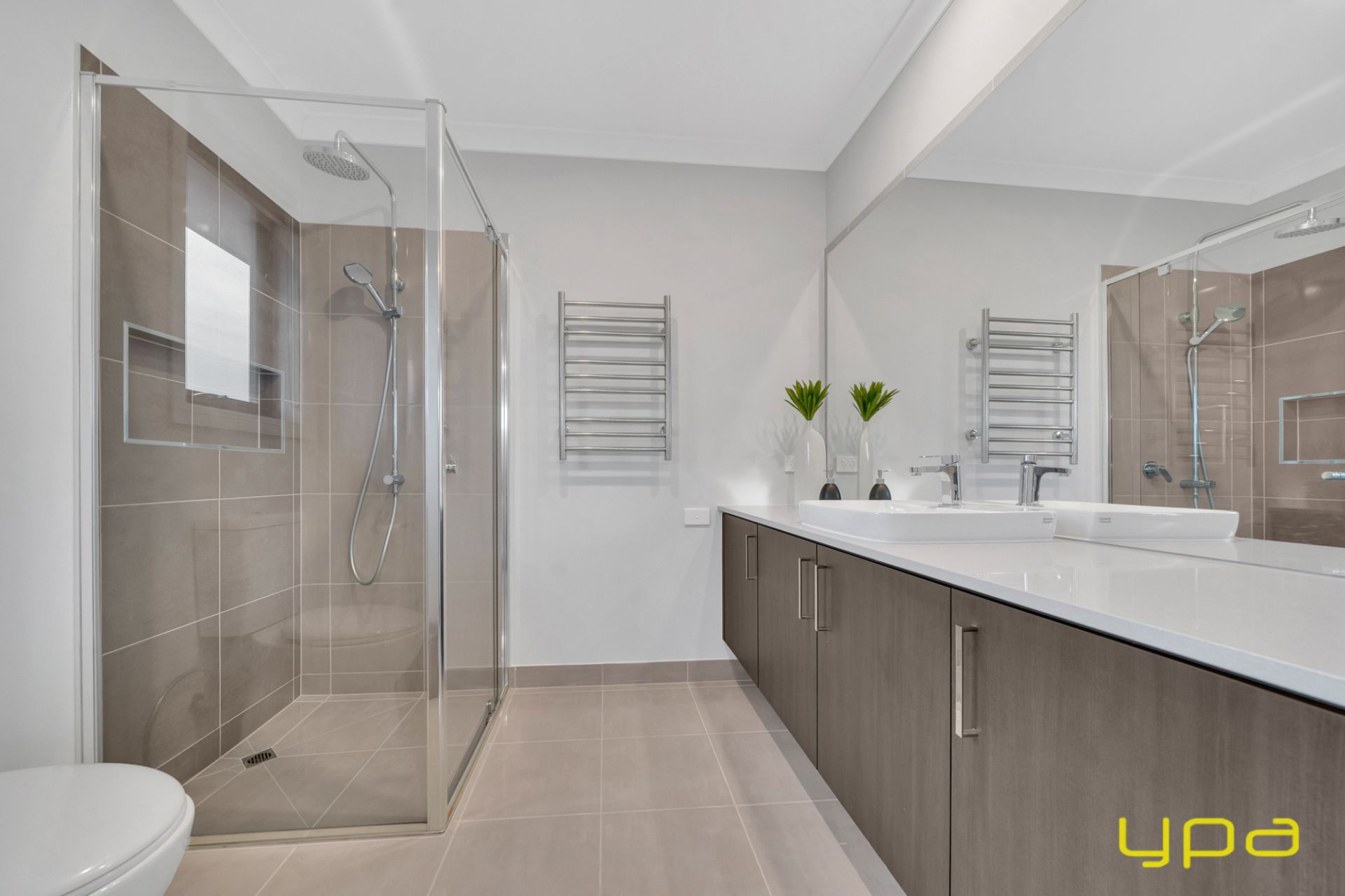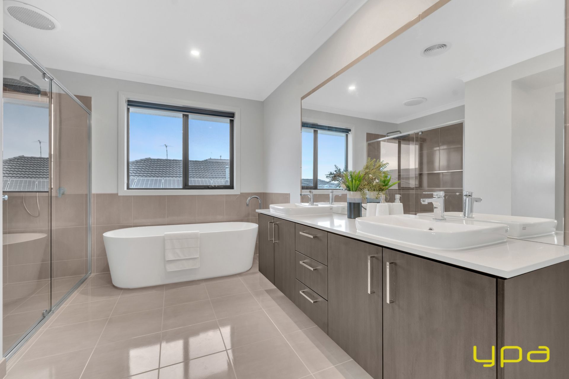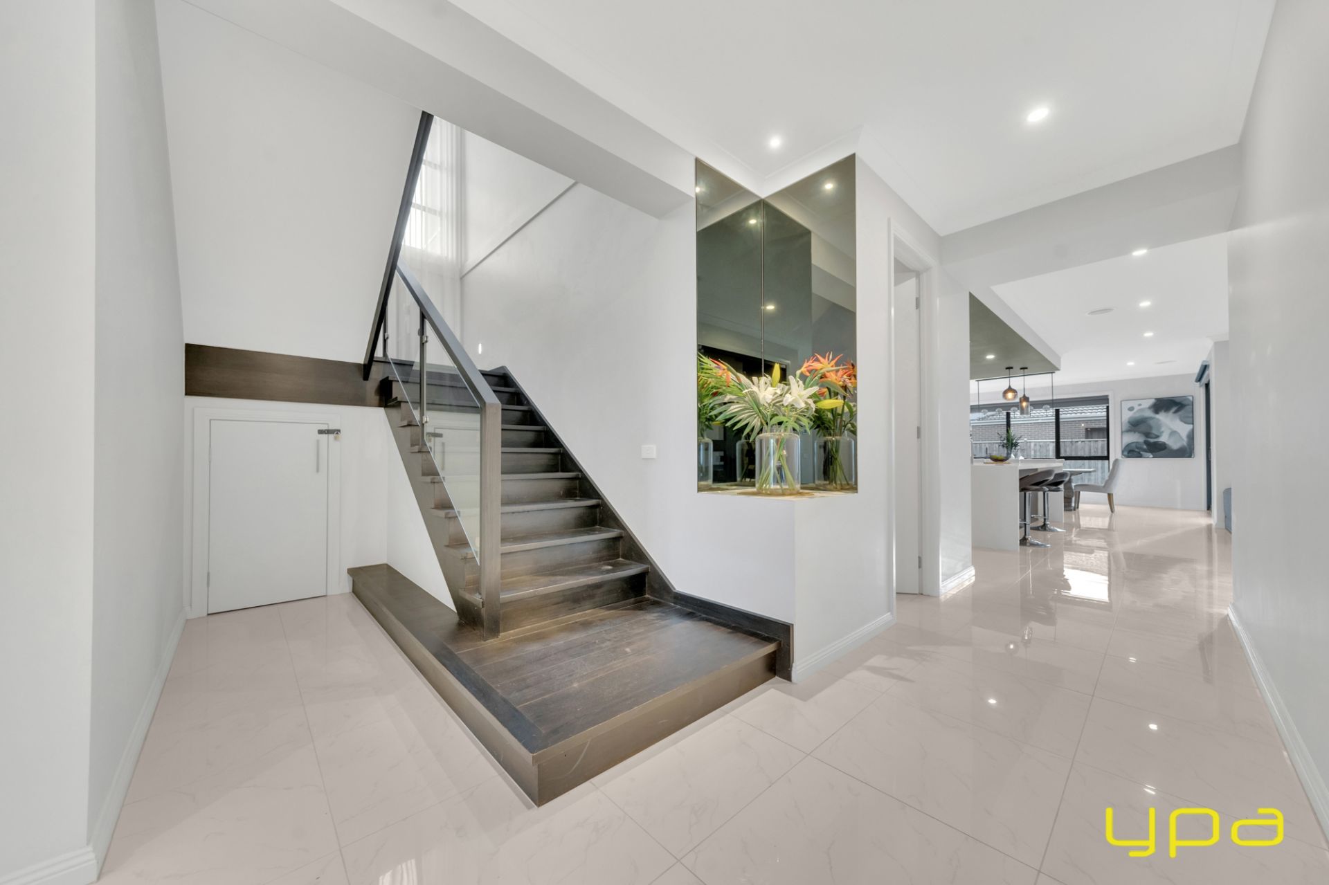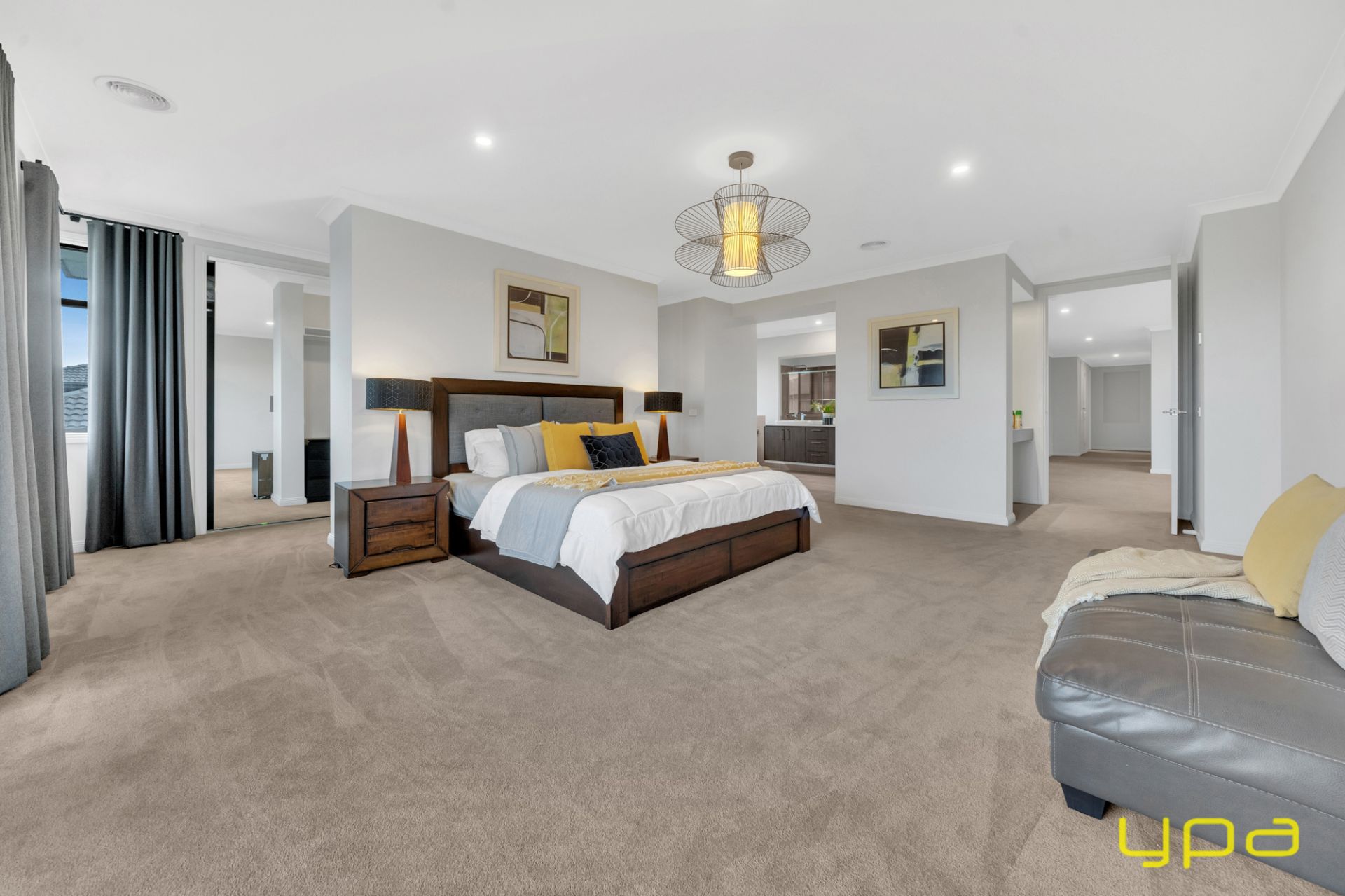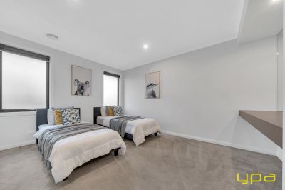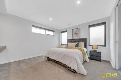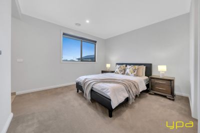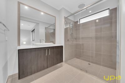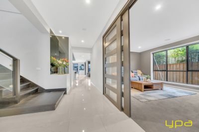 A beautiful dark wooden staircase takes you upstairs where you'll find a spacious rumpus room and all the bedrooms with walk-in robes and ensuites. Indulge in ultimate relaxation in the spacious master bedroom boasting a hidden walk-in wardrobe accessible from both sides. A private balcony offers park and lake views, while feature lighting enhances the ambiance. The ensuite is a sanctuary with an enormous bathtub, large shower, and double vanity.