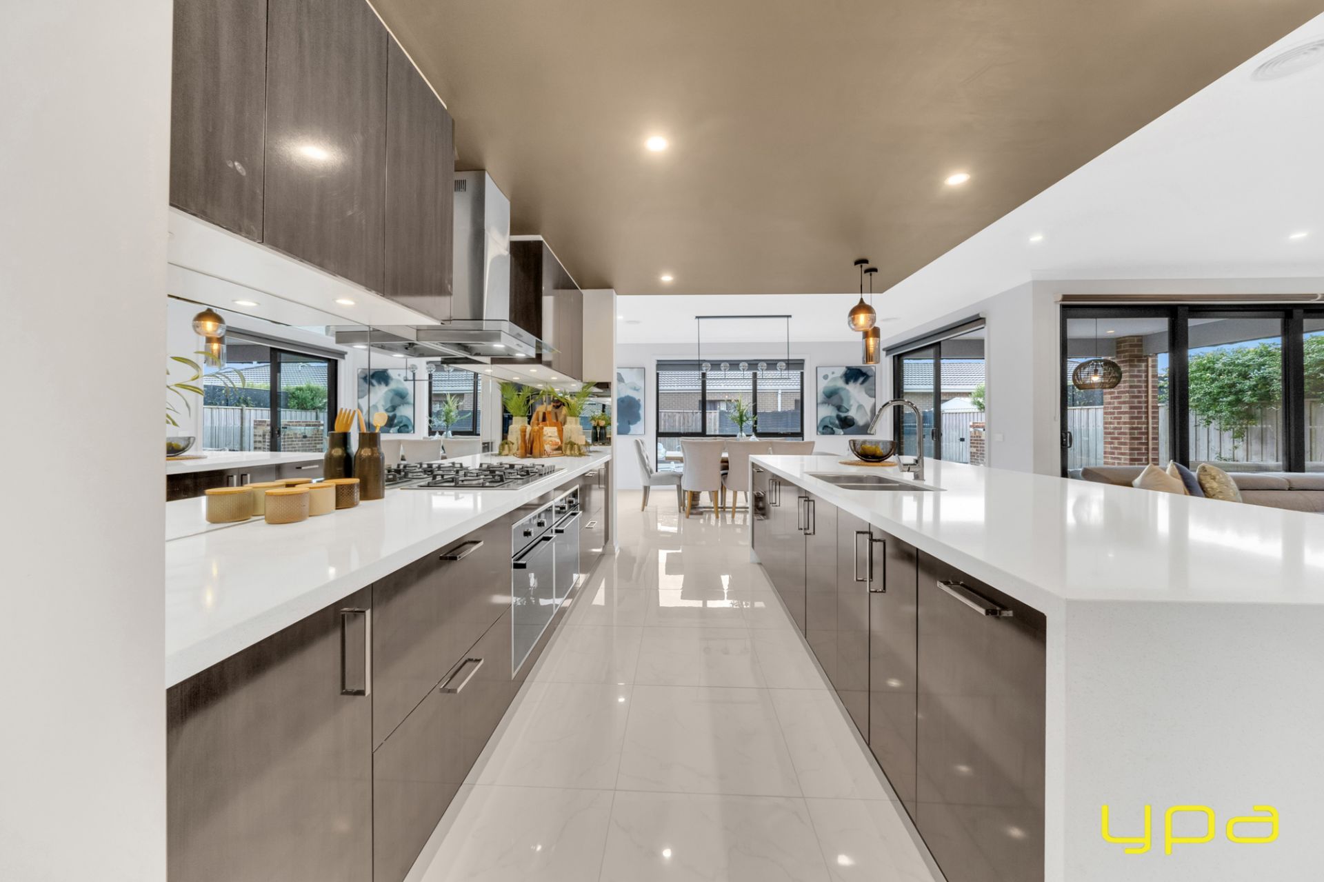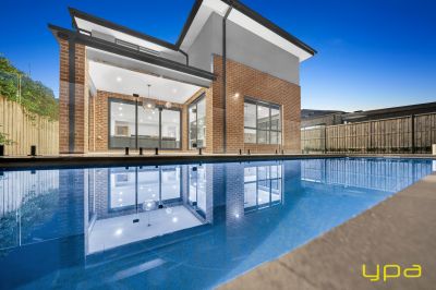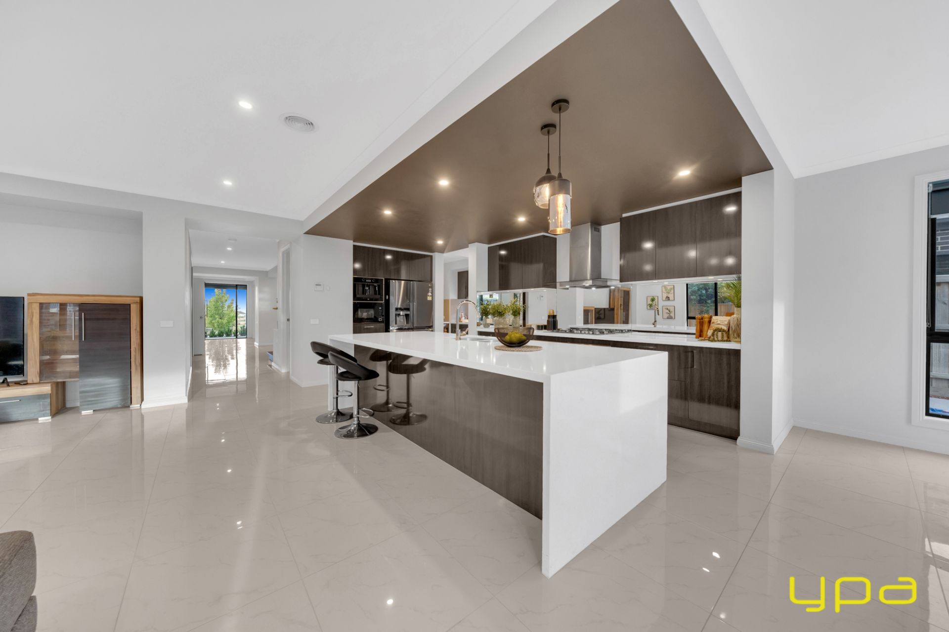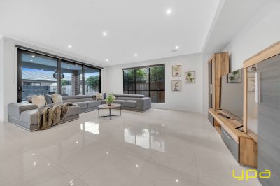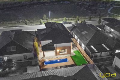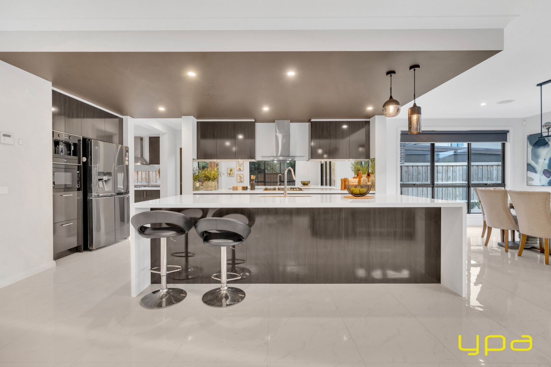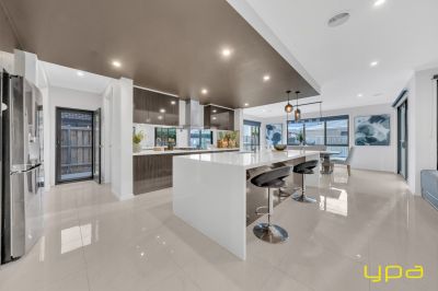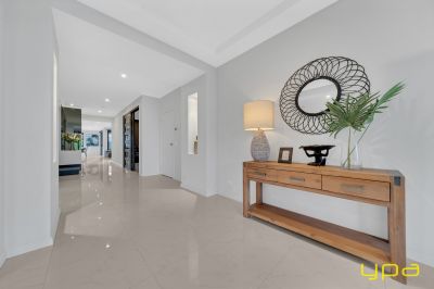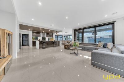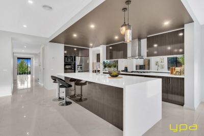 The central living zone is a true work of art, perfect for those who appreciate the right combination of contemporary style and effortless comfort. The sleek kitchen is adorned with feature lighting that illuminates the stunning waterfall stone countertop, creating a visual spectacle. A butler's pantry adds functionality and convenience, while a sleek breakfast bar invites casual dining. The glossy, high-quality tiles that flow throughout the space exude a sense of opulence and durability. Abundant natural light streams in through numerous windows, creating a bright and airy ambiance. The space seamlessly connects to an outdoor oasis with a heated pool and an expansive alfresco, blurring the lines between indoor and outdoor living and dining.