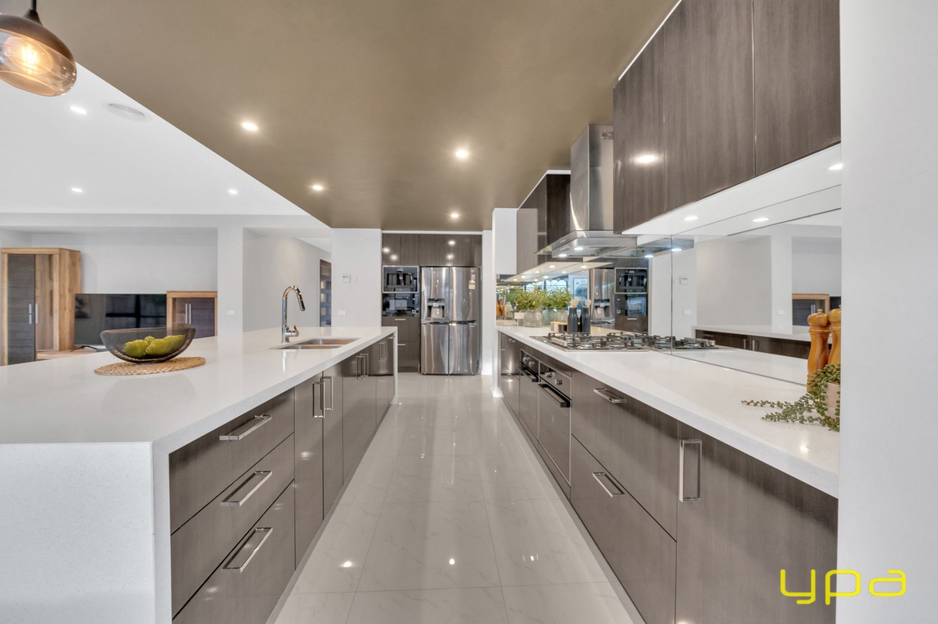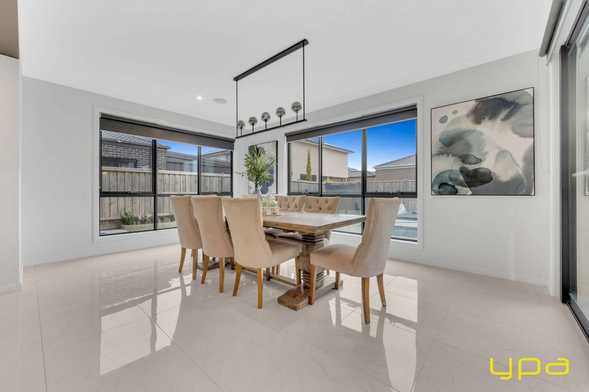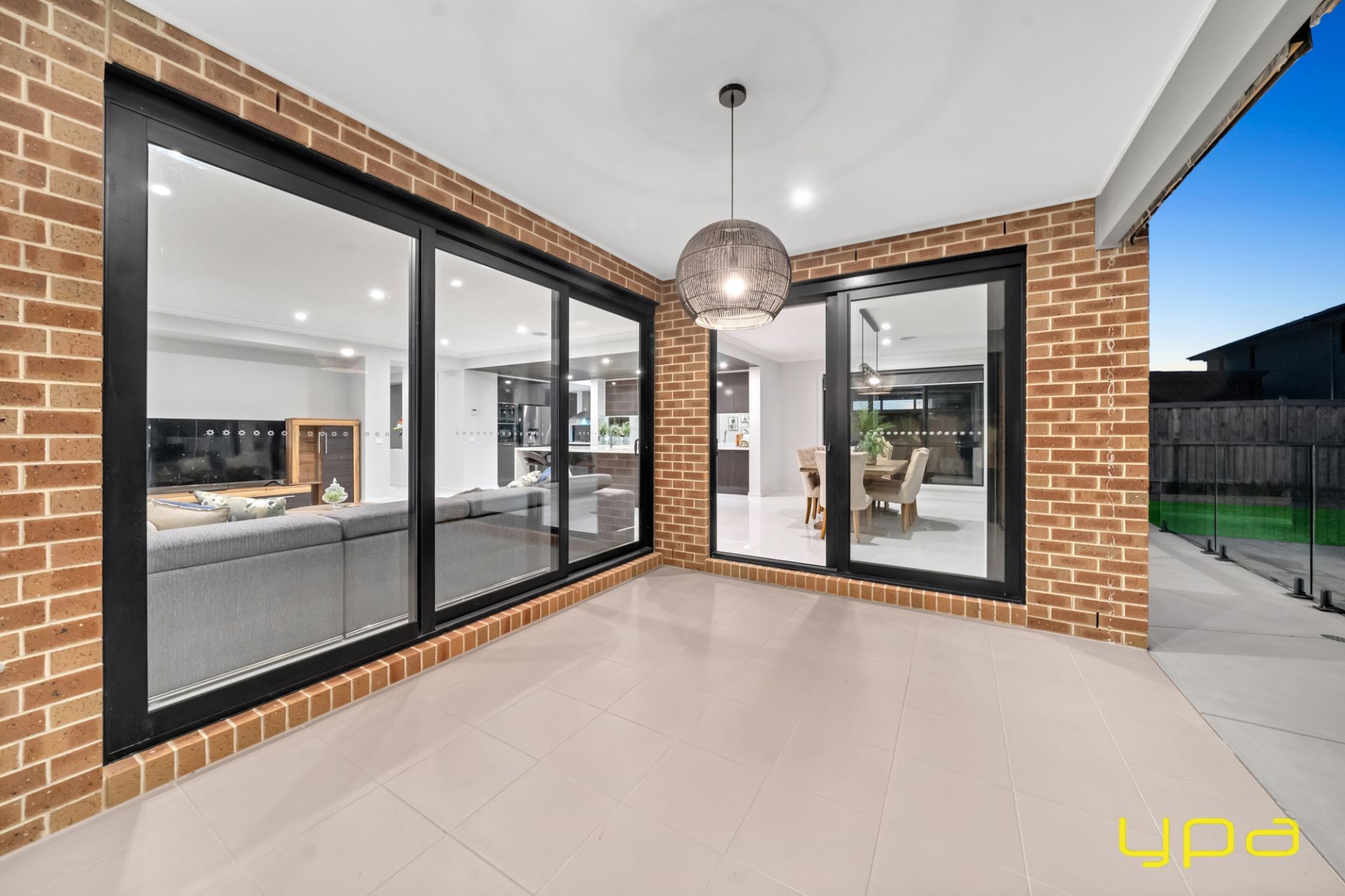 The central living zone is a true work of art, perfect for those who appreciate the right combination of contemporary style and effortless comfort. The sleek kitchen is adorned with feature lighting that illuminates the stunning waterfall stone countertop, creating a visual spectacle. A butler's pantry adds functionality and convenience, while a sleek breakfast bar invites casual dining. The glossy, high-quality tiles that flow throughout the space exude a sense of opulence and durability. Abundant natural light streams in through numerous windows, creating a bright and airy ambiance. The space seamlessly connects to an outdoor oasis with a heated pool and an expansive alfresco, blurring the lines between indoor and outdoor living and dining.