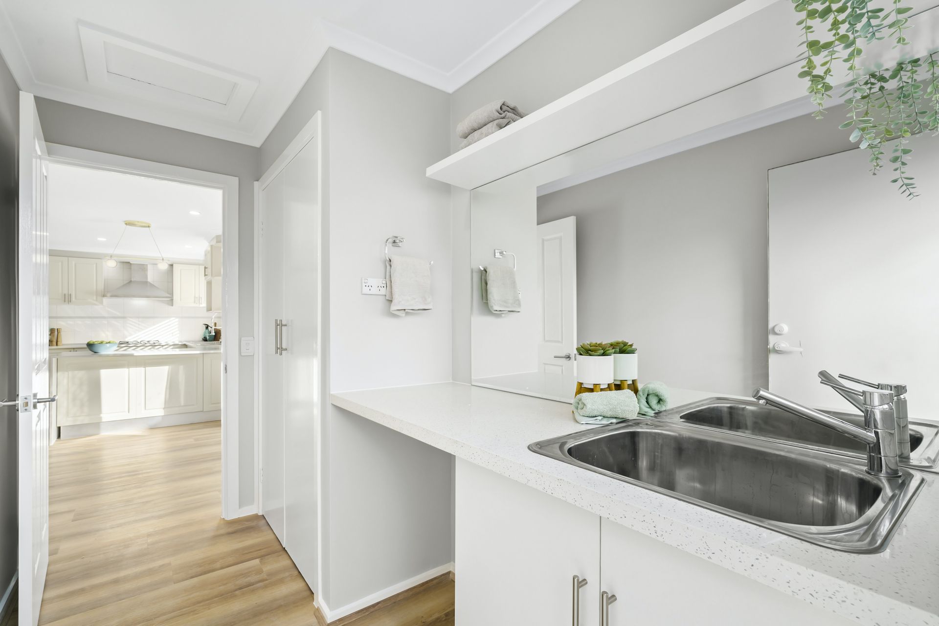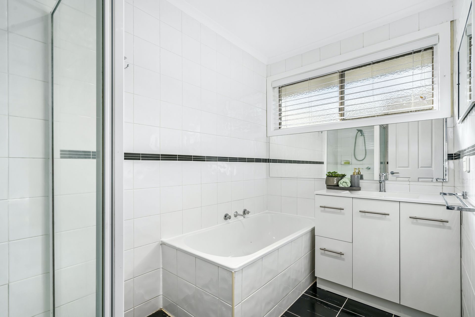 The large bathroom boasts chic black and white styling and a separate toilet. A newly fitted out laundry could double as a mudroom or even a glam room with its oversized mirror and ample additional storage.