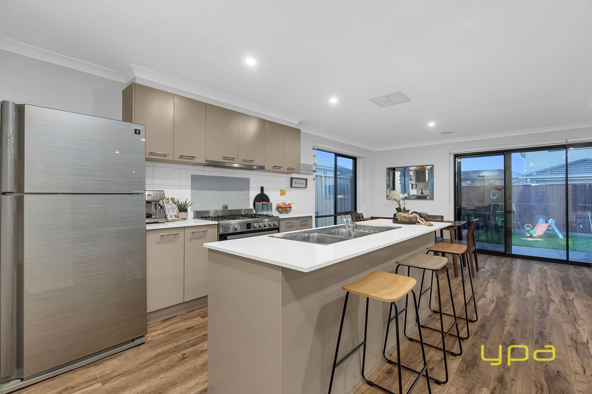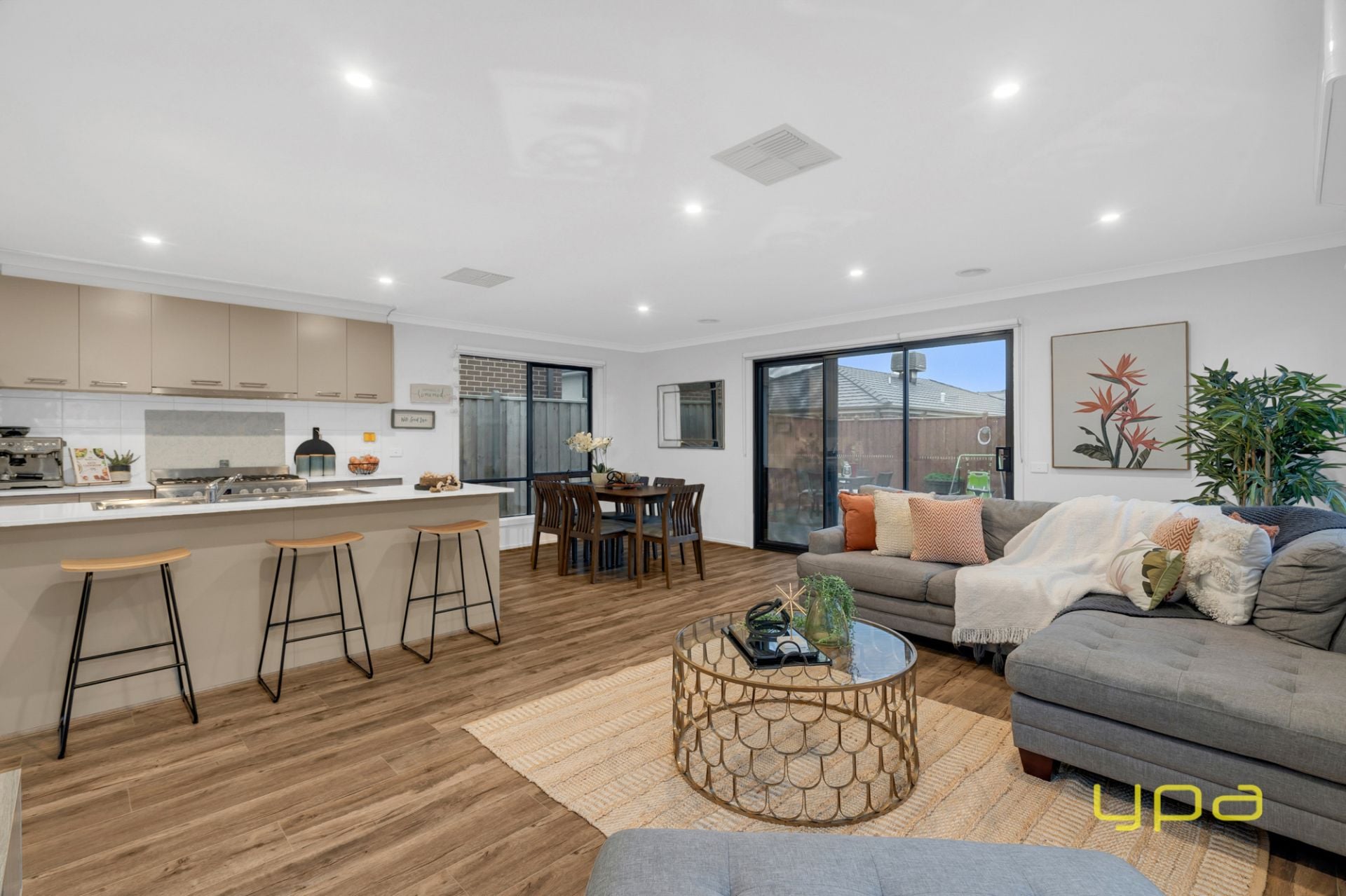The modern kitchen sits at the heart of the home with light colored bench tops, breakfast bar, sleek cabinetry, an accessible pantry, plenty of cabinet space and premium stainless-steel appliances, including dishwasher. It opens on to a formal dining area and living zone, a great space for family meals and relaxation. This spacious living space flows seamlessly through sliding doors to the entertainment/outdoor area which is a great space for the kids to play or to enjoy with friends and family, while overlooking the beautiful established small garden.