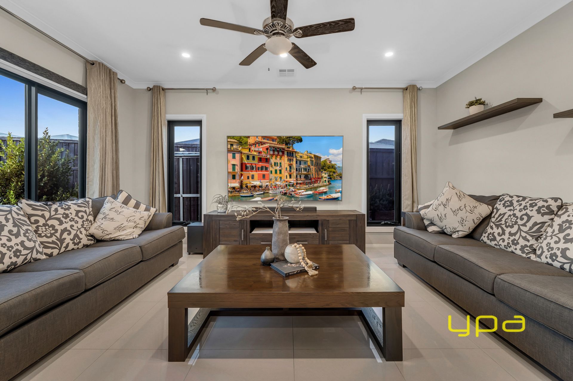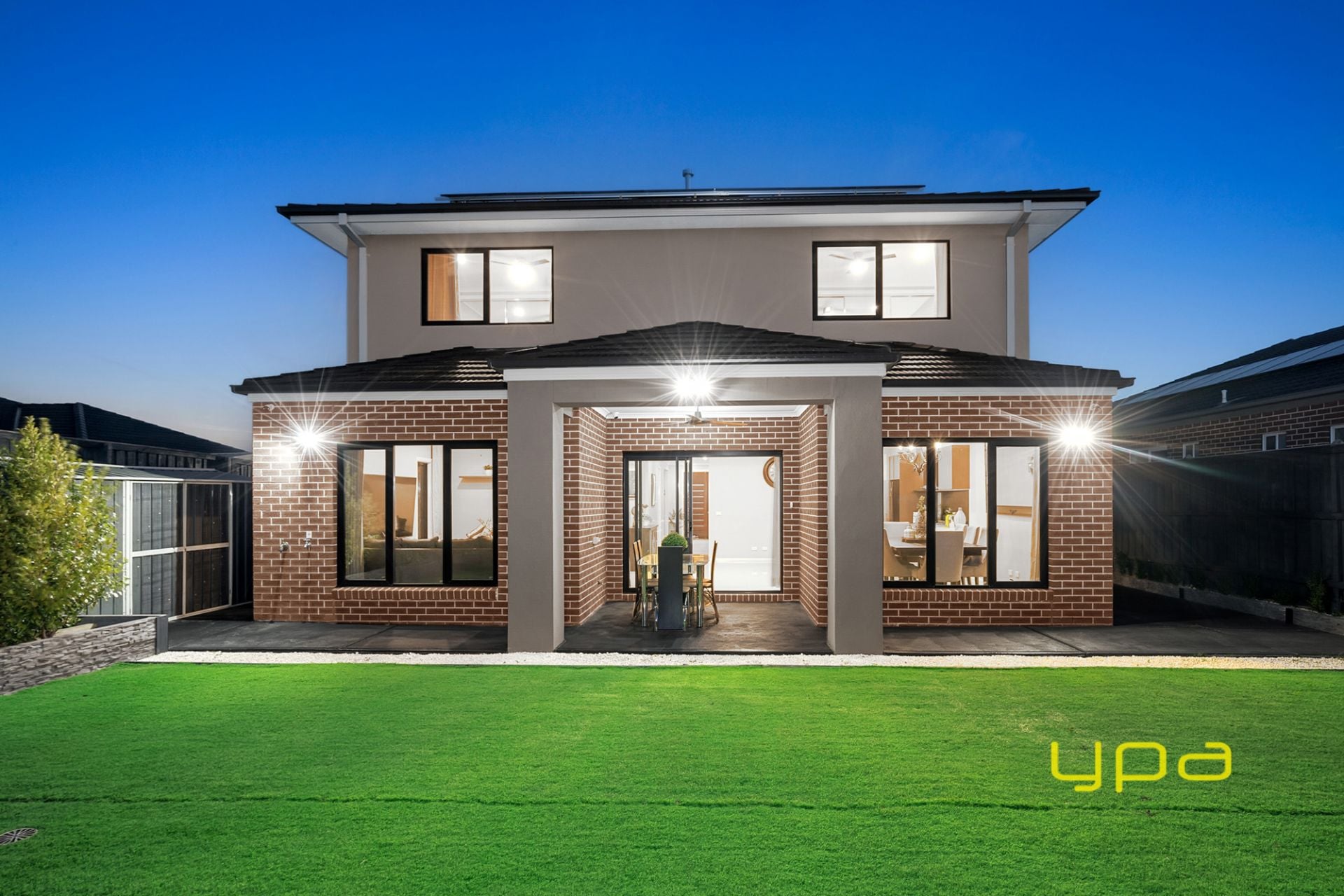 Expansive tri-fold sliding doors seamlessly lead you to an exceptional decked alfresco space and a low-maintenance backyard featuring synthetic grass. This expansive outdoor area offers ample space for children to play and sets the scene for enjoyable BBQs and summer soirees.