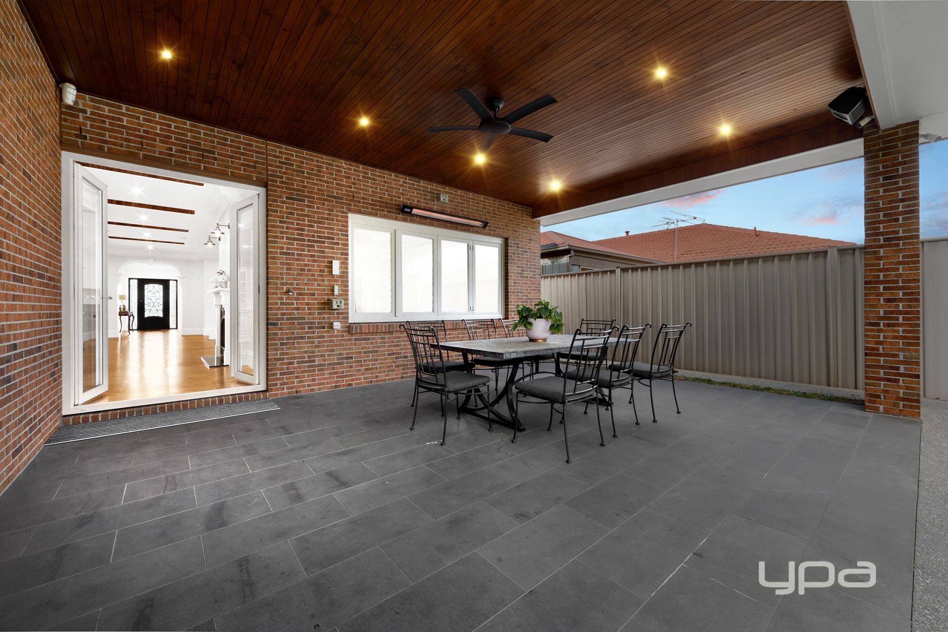 ° Alfresco living featuring outdoor speakers, 3000 watt strip heater and a fan for comfort and natural gas point for your BBQ