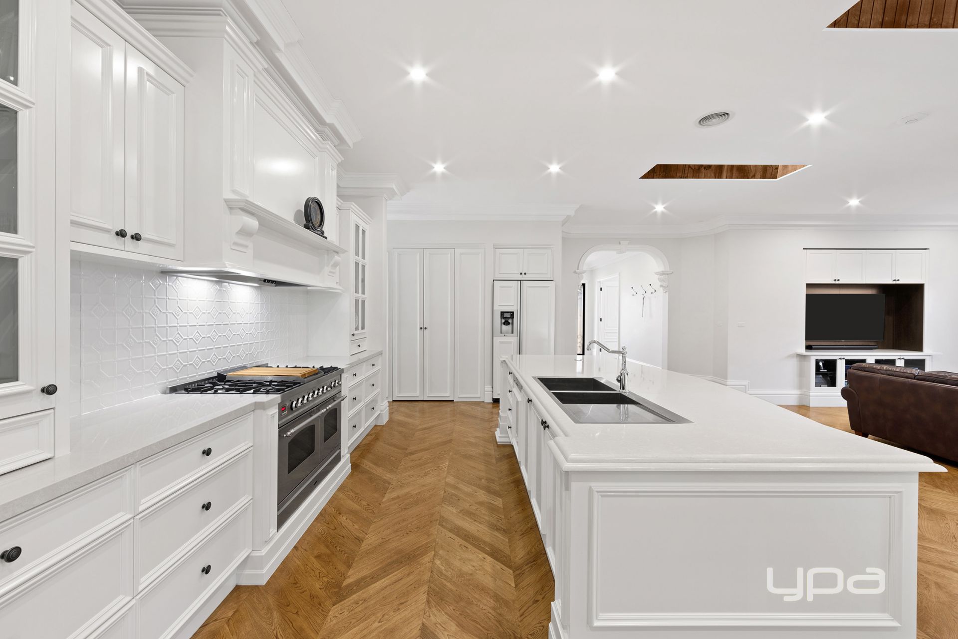 ° The 2-Pac custom kitchen features stone benchtops, soft-close drawers, and cabinets, along with top-of-the-line hand made in Italy ILVE Nostalgie series 100cm freestanding twin oven with teppanyaki plate, and a walk-in pantry