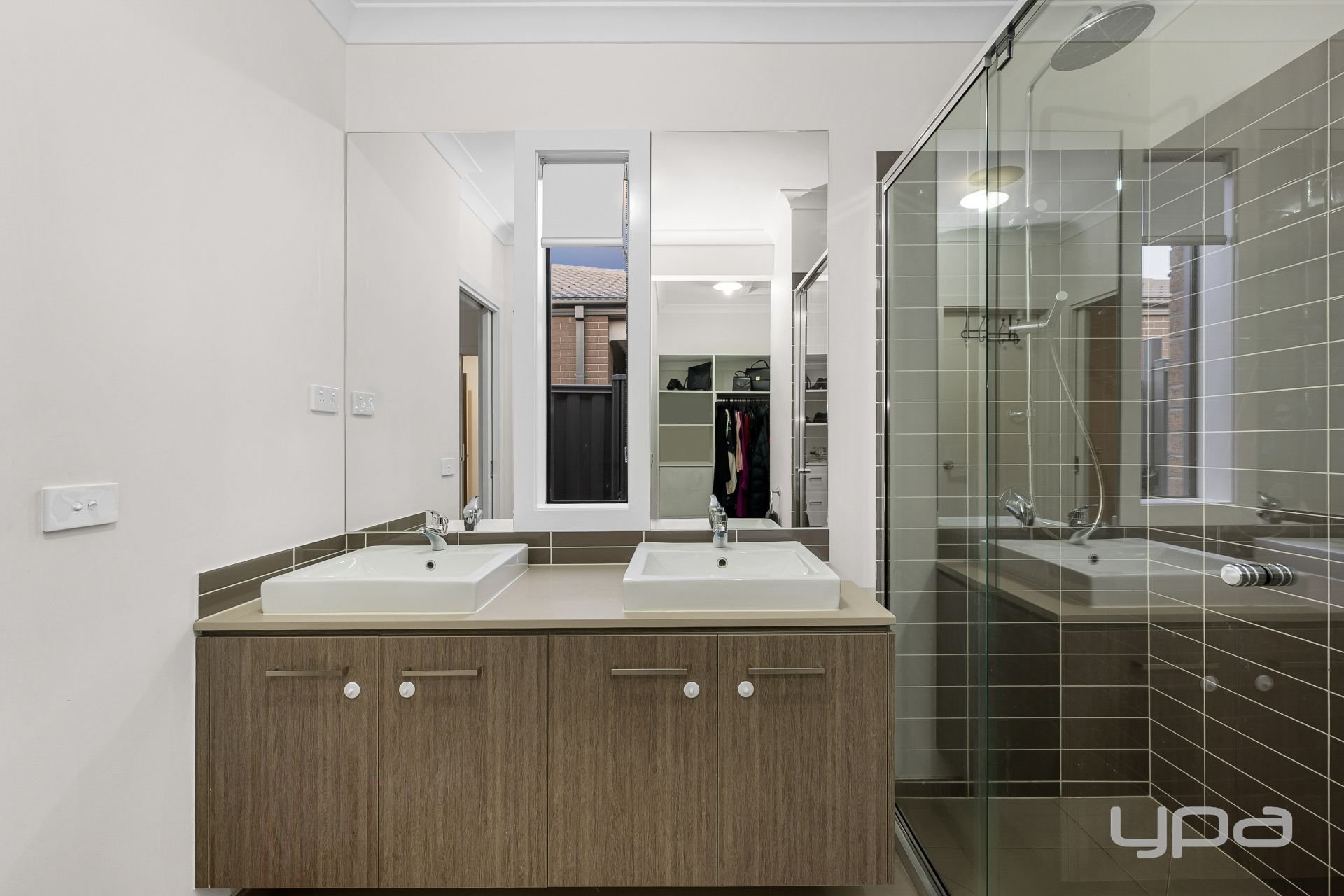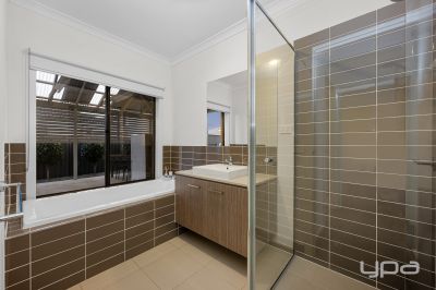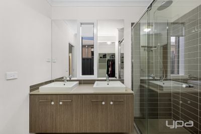 • Master bedroom showcases a ceiling fan, walk-in wardrobe and ensuite with stone bench top and double vanity