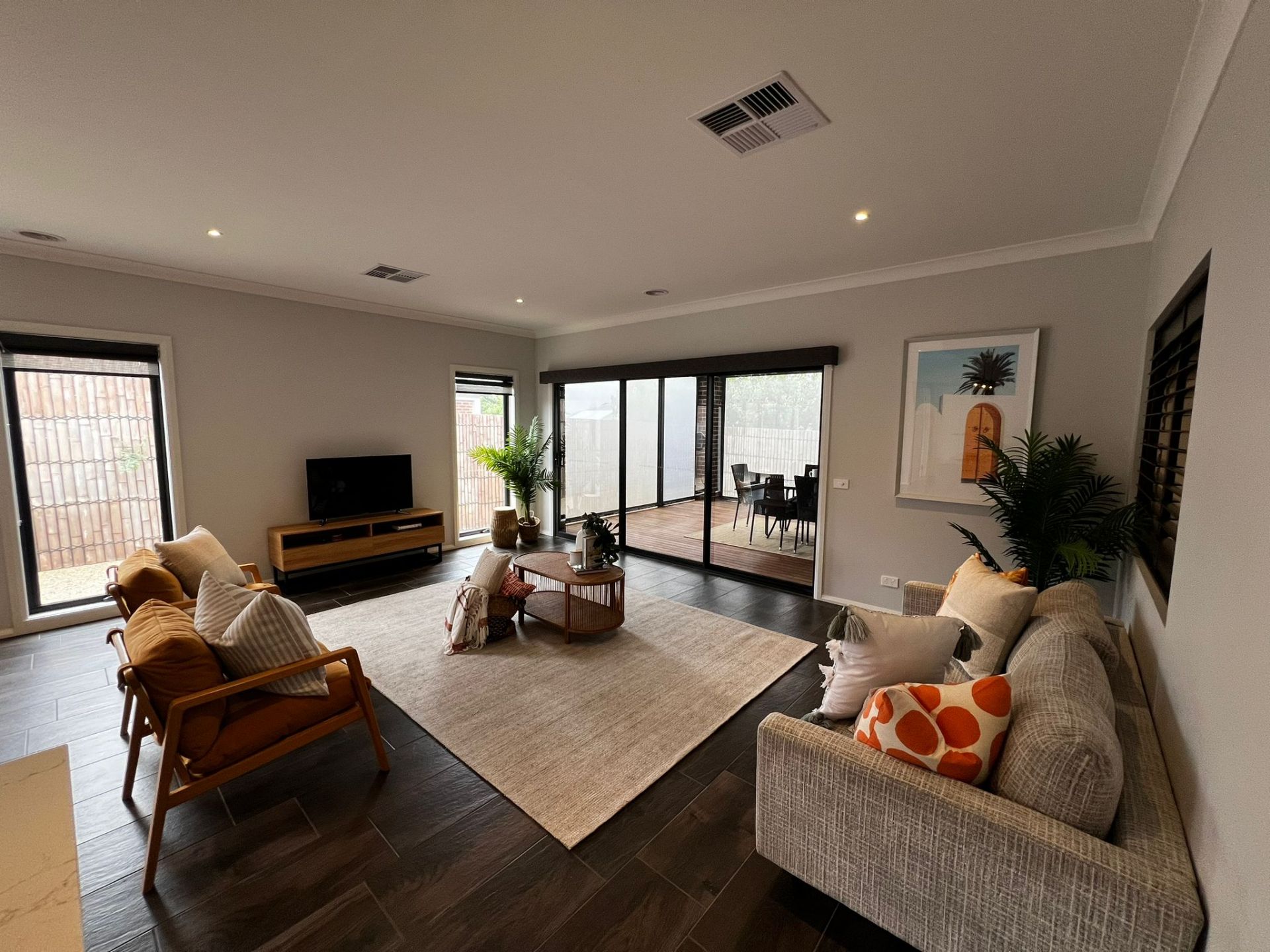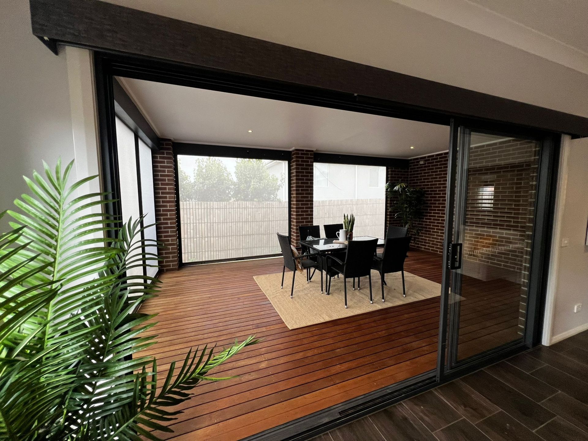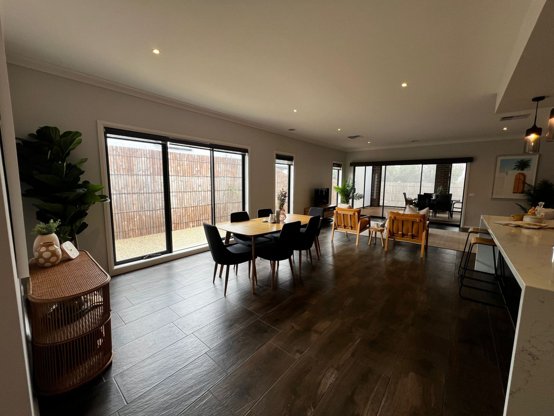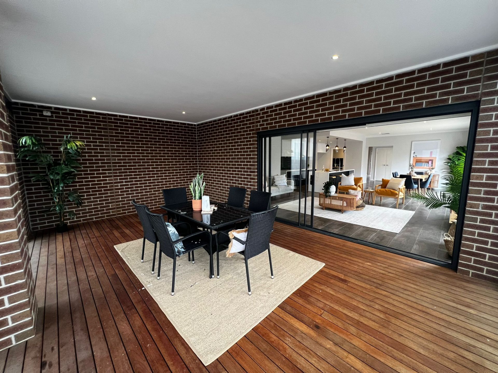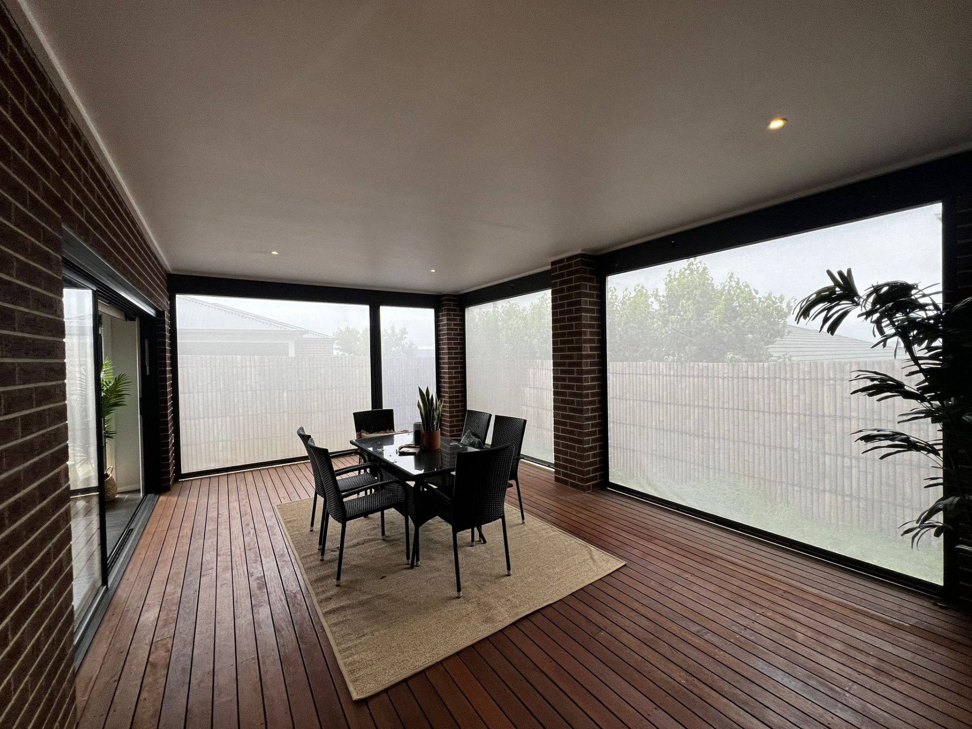 Outdoor Charm: Enjoy a well-designed exterior with an exposed aggregate driveway and footpaths surrounding the home, lavish manicured landscaped gardens, expansive and enclosed Merbau decking with pull-down blinds throughout, a small rear garden, and bamboo fencing.