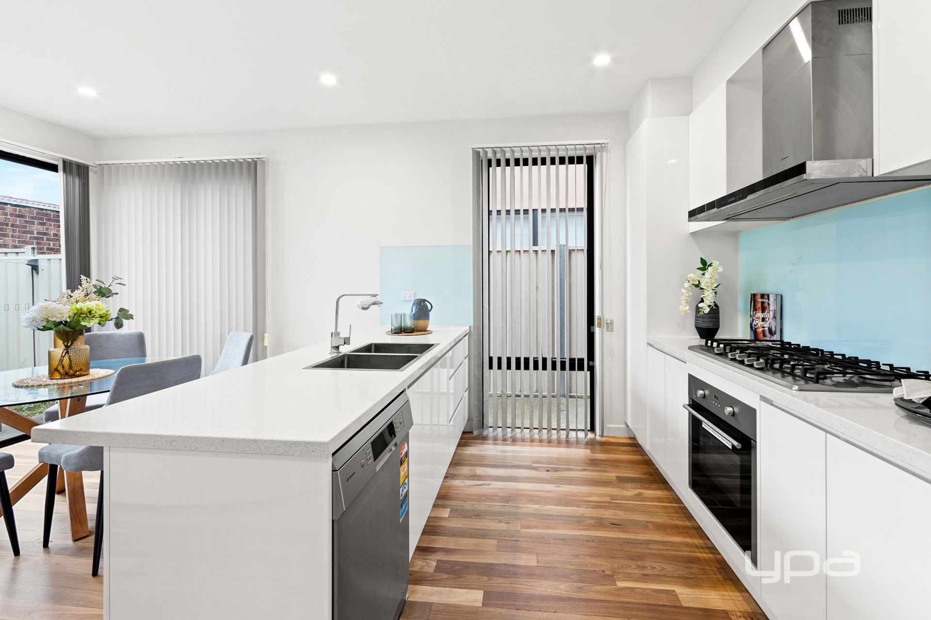 The open-plan kitchen and living area, complete with a dishwasher, offers a seamless blend of functionality and style. Beautiful floorboards throughout add a touch of elegance to the space.