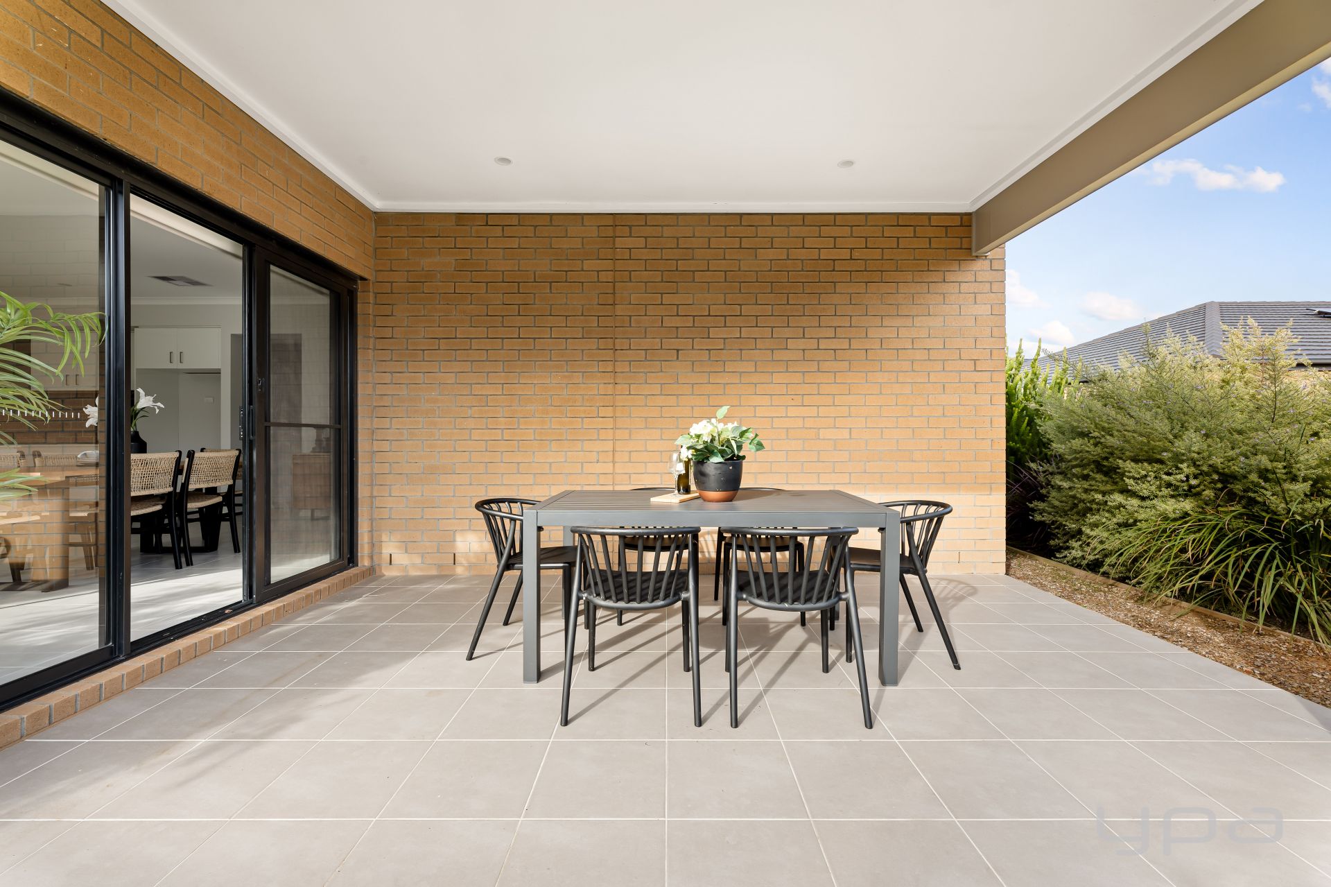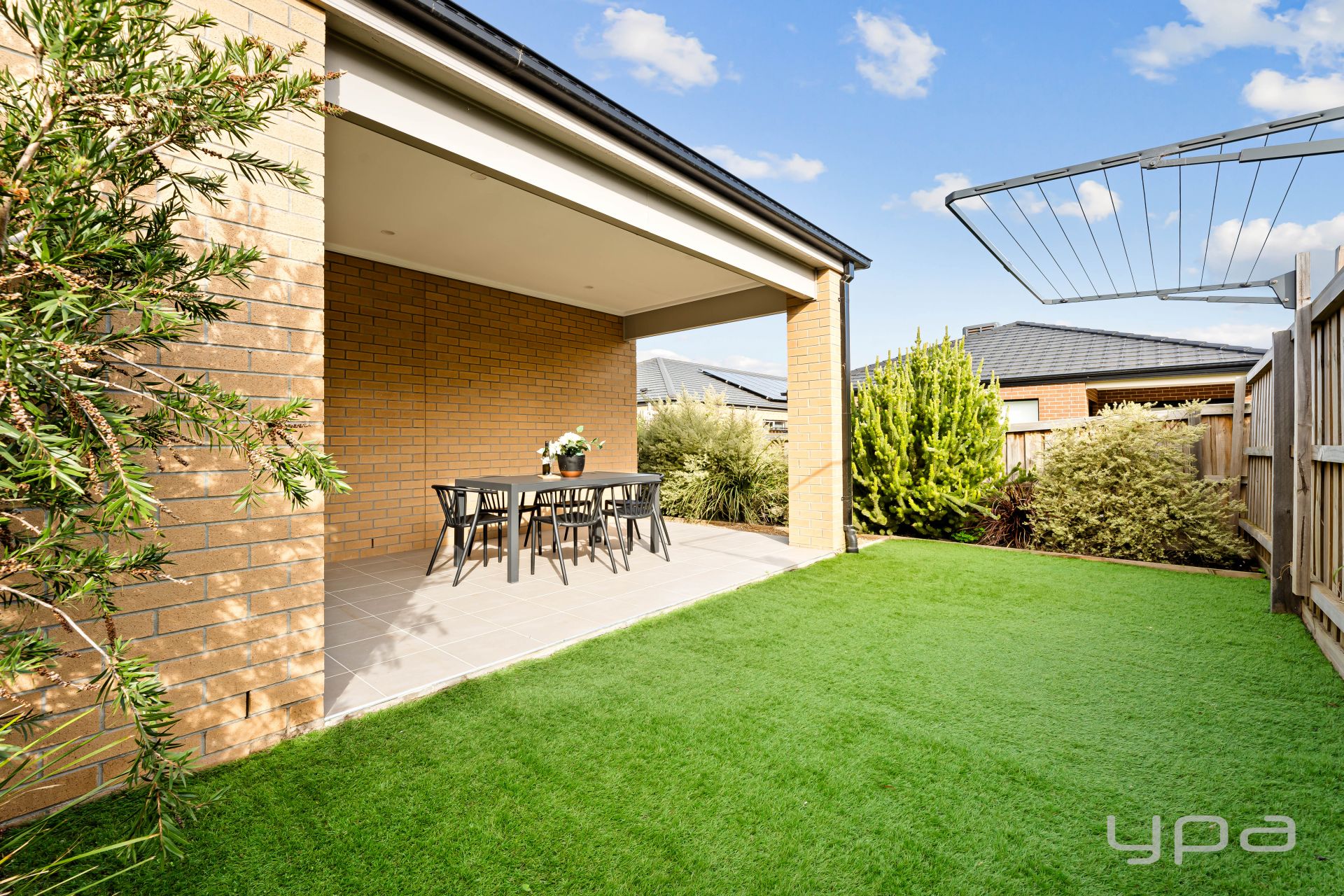 The black yard is composed of grass and concrete making up a low maintenance space