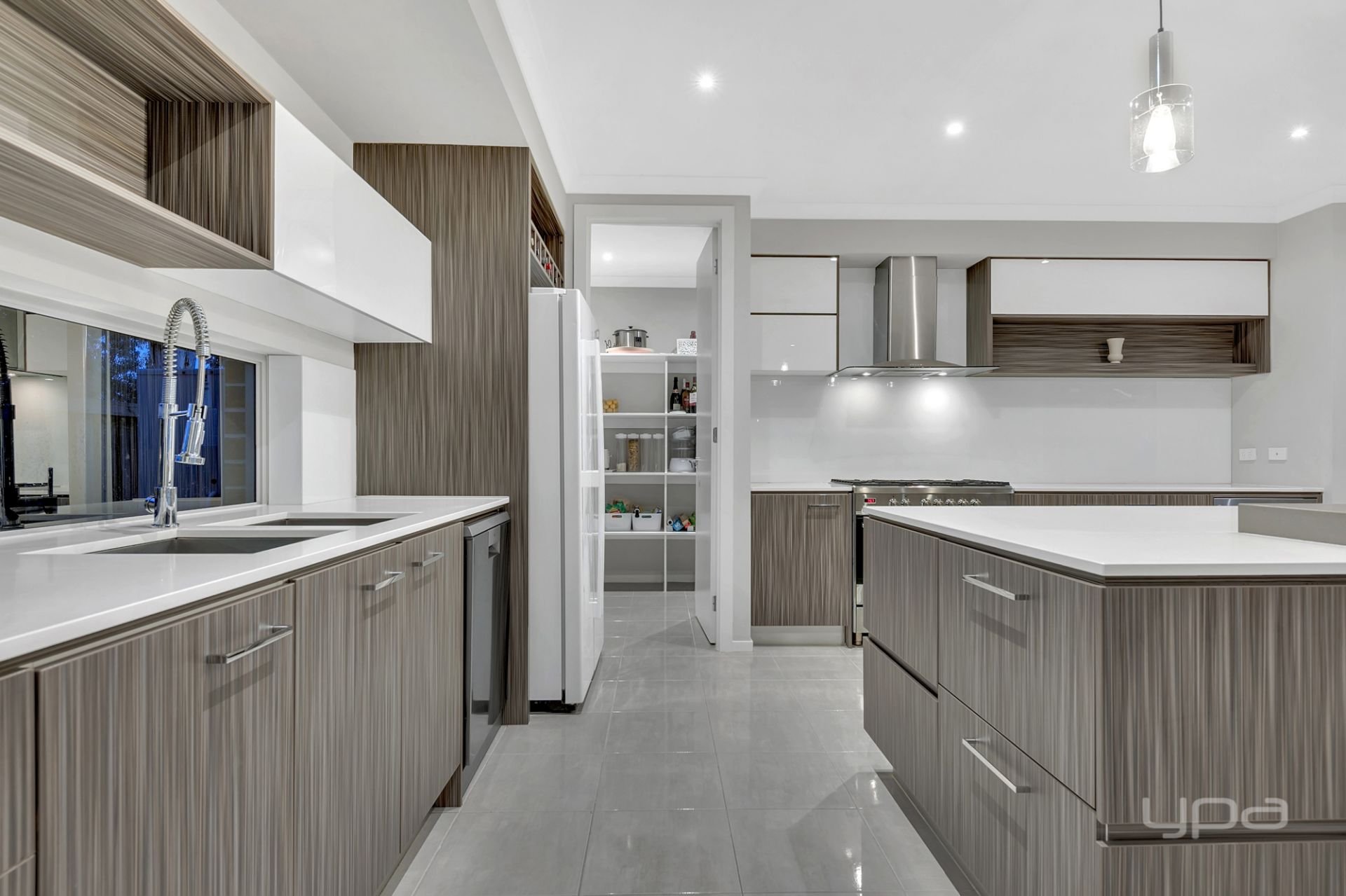 The living areas are designed with an open-plan layout, enhanced by in-built speakers on both floors, creating a seamless flow and a display home feel. At the heart of the home is the grand kitchen, a culinary masterpiece boasting a large abstract stone benchtop, ample storage, and a walk-in pantry. This kitchen is perfect for the avid chef and is sure to impress even the most discerning buyer. It effortlessly extends into the alfresco area, making indoor-outdoor entertaining a breeze.