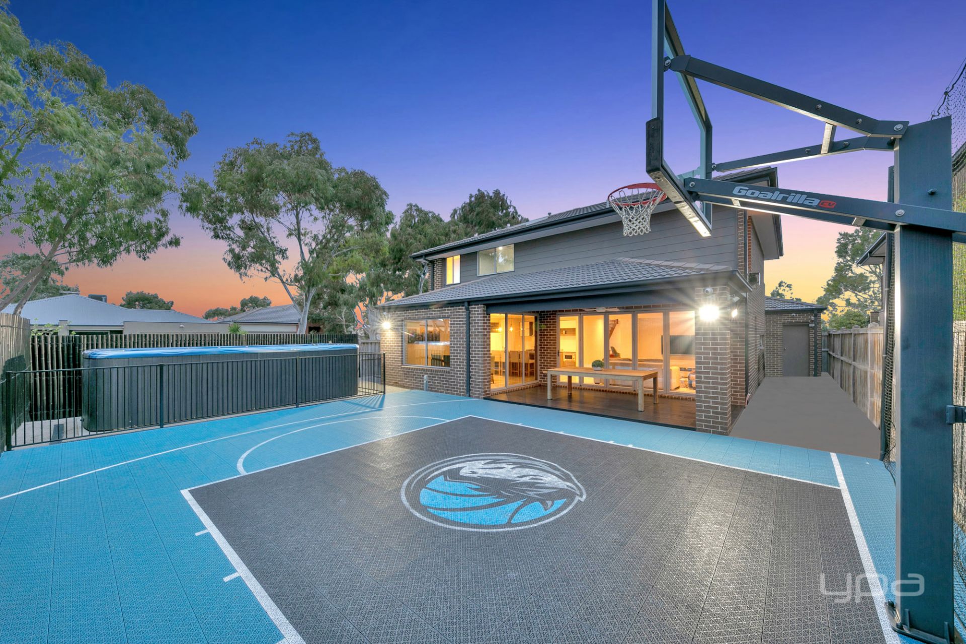 The outdoor space is equally impressive, featuring a sprawling sprung/click basketball court, masterfully crafted by MSF Sports. This court offers endless opportunities for fun and fitness, catering to sports enthusiasts of all ages. Complementing this area is a massive above-ground spa, providing a tranquil oasis to unwind after a long day.