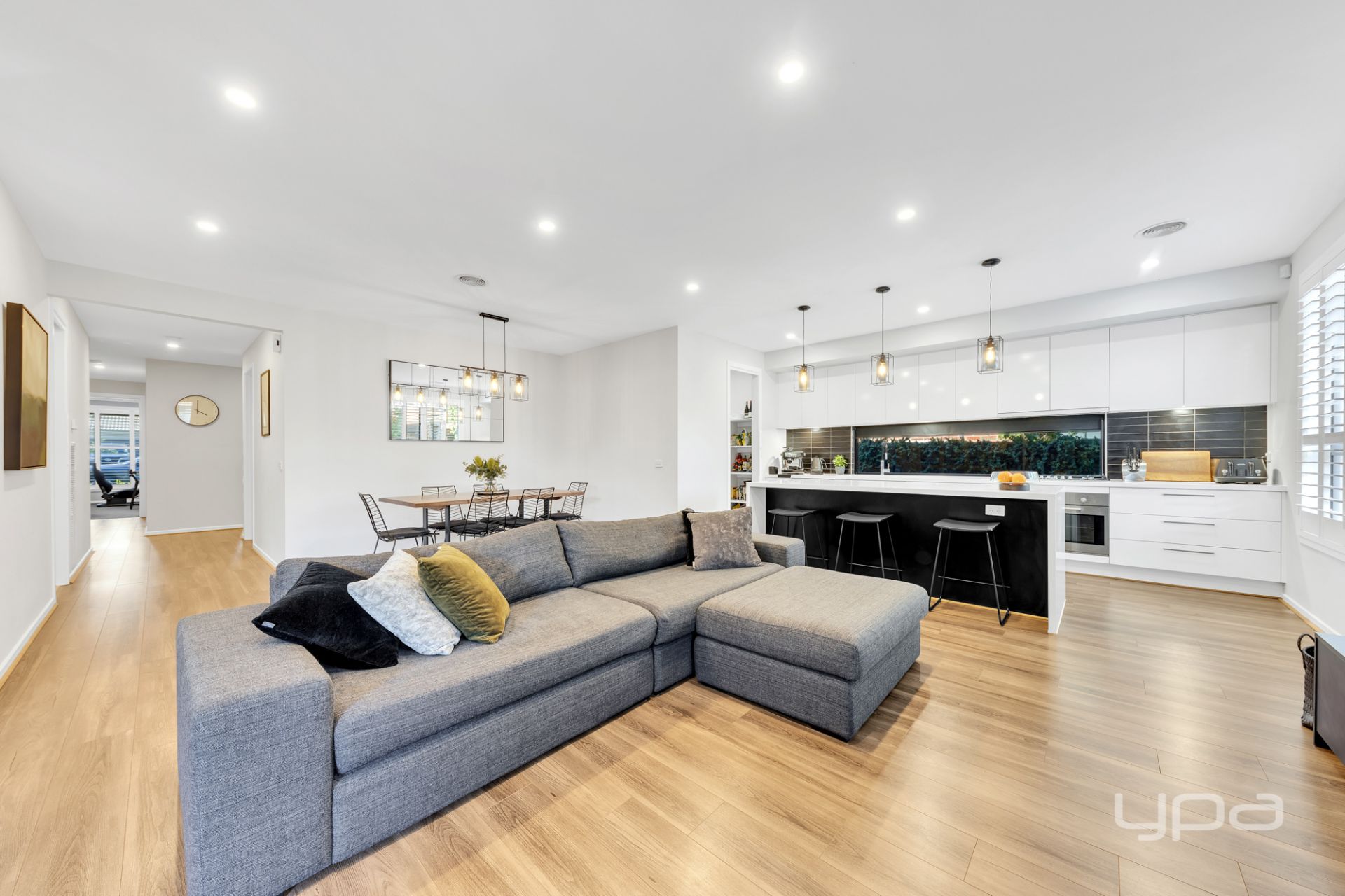 Upon arrival, you'll be captivated by the striking facade, exuding elegance and sophistication. The home's exterior features plantation shutters that not only ensure privacy but also add a touch of class to its curb appeal. Step inside, and you'll immediately notice the premium laminate flooring that flows throughout, setting the tone for the impeccable attention to detail found in every corner.