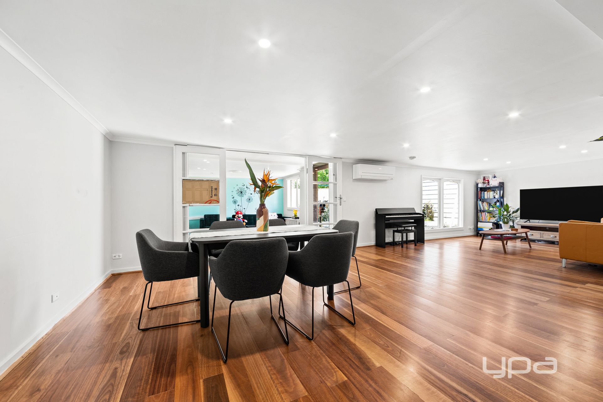 Polished floorboards throughout the home lend a touch of sophistication, while air conditioning systems keep the temperature just right year-round.