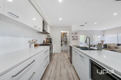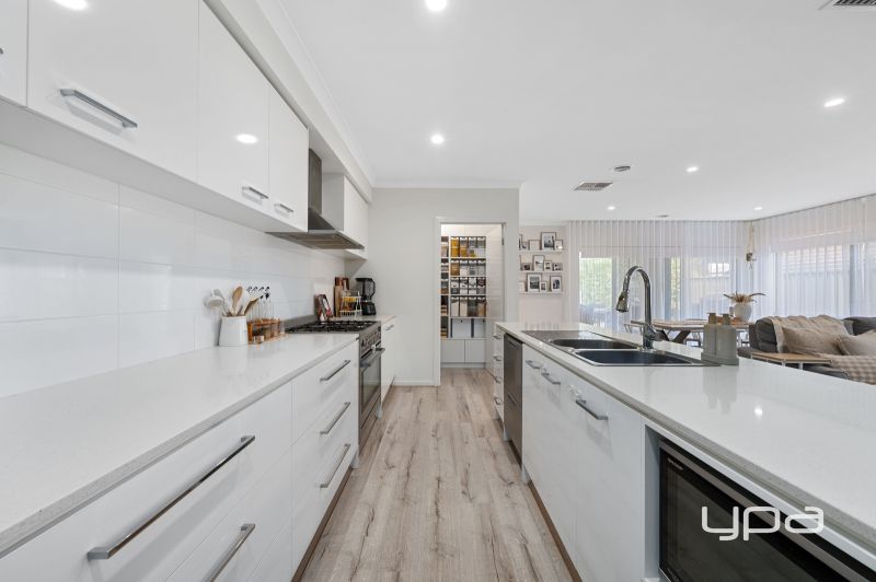 The gorgeous kitchen is a chef's dream, boasting upgraded appliances, stone benchtops, a dishwasher, pot drawers, ample bench space, and a walk-in pantry.