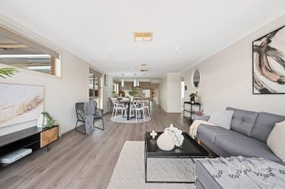 Moving through the hallway you will find the large formal living area providing ample space for the whole family which features an abundance of natural light. Continuing through to the heart of the home you are met with an open modern kitchen, complete with 900mm undermount oven and gas cook top with a tiled splashback, dishwasher, and ample storage, this space flows effortlessly into the open plan meals area and spacious living area.