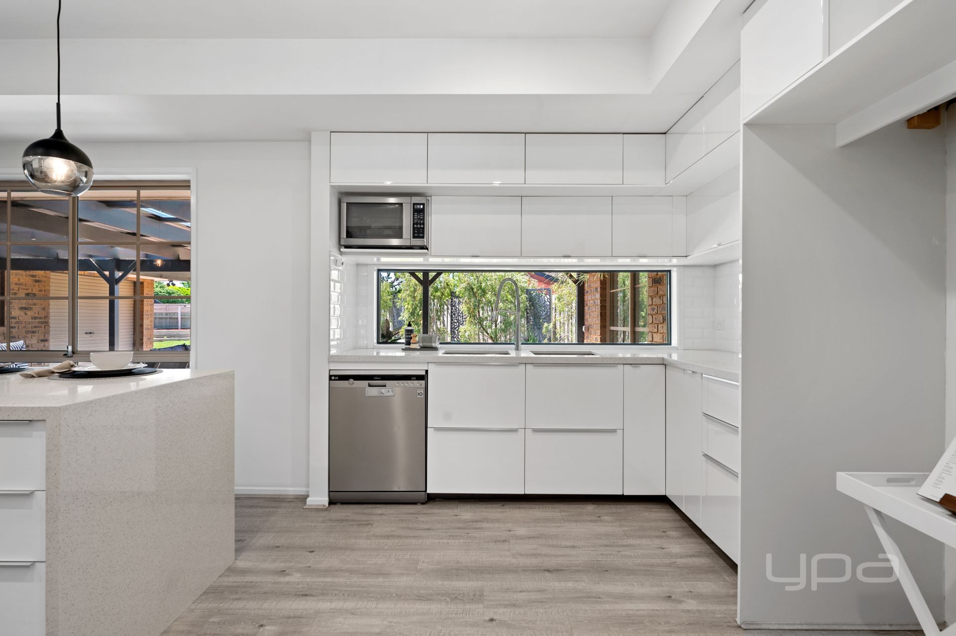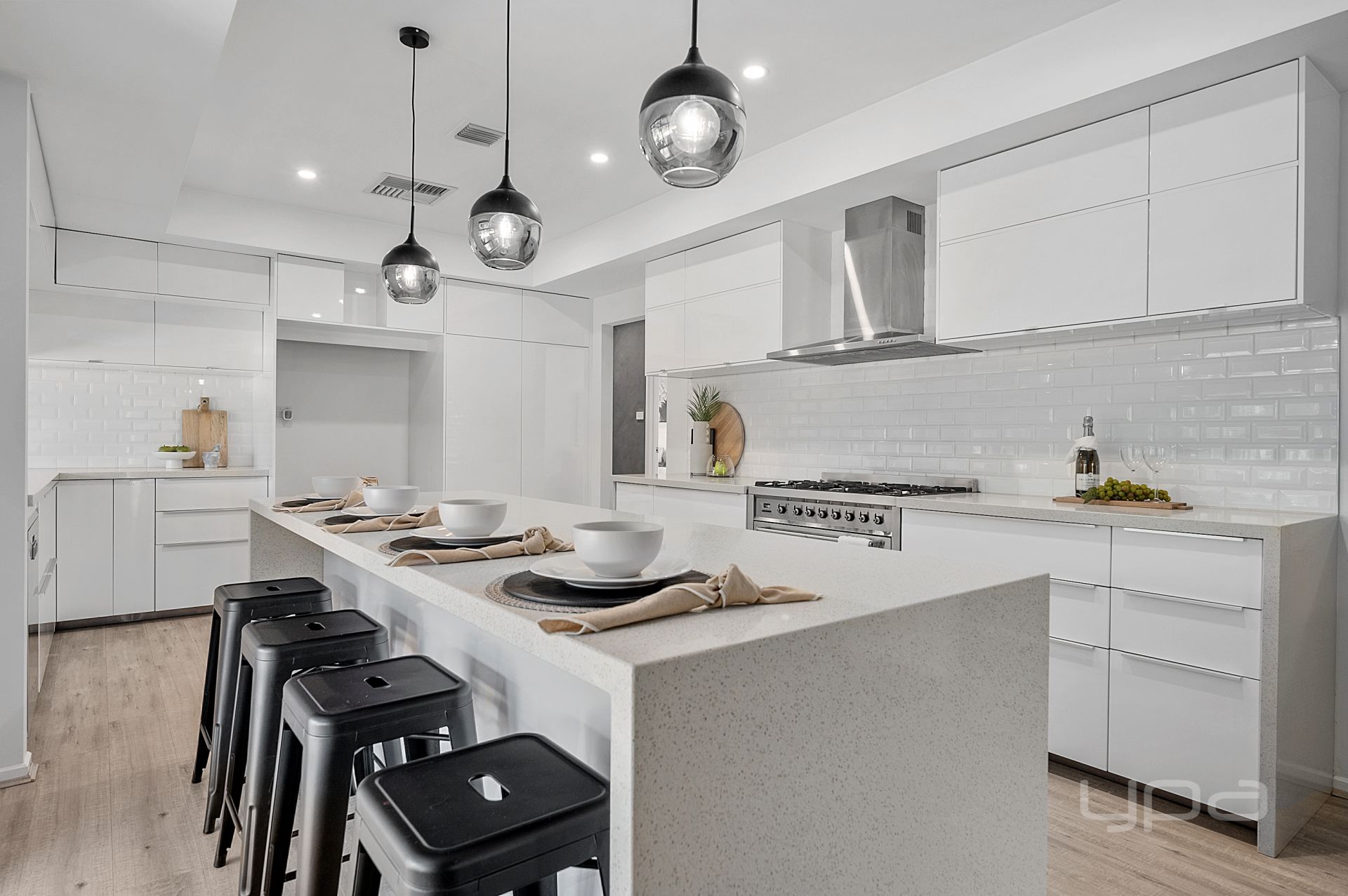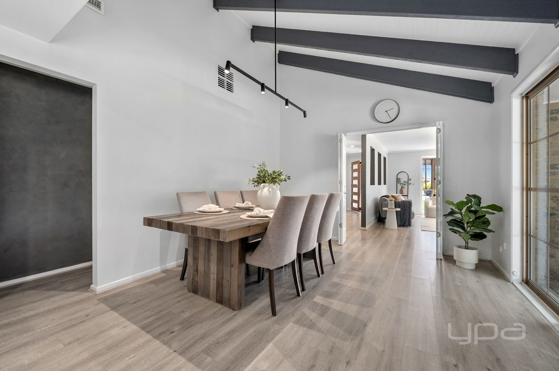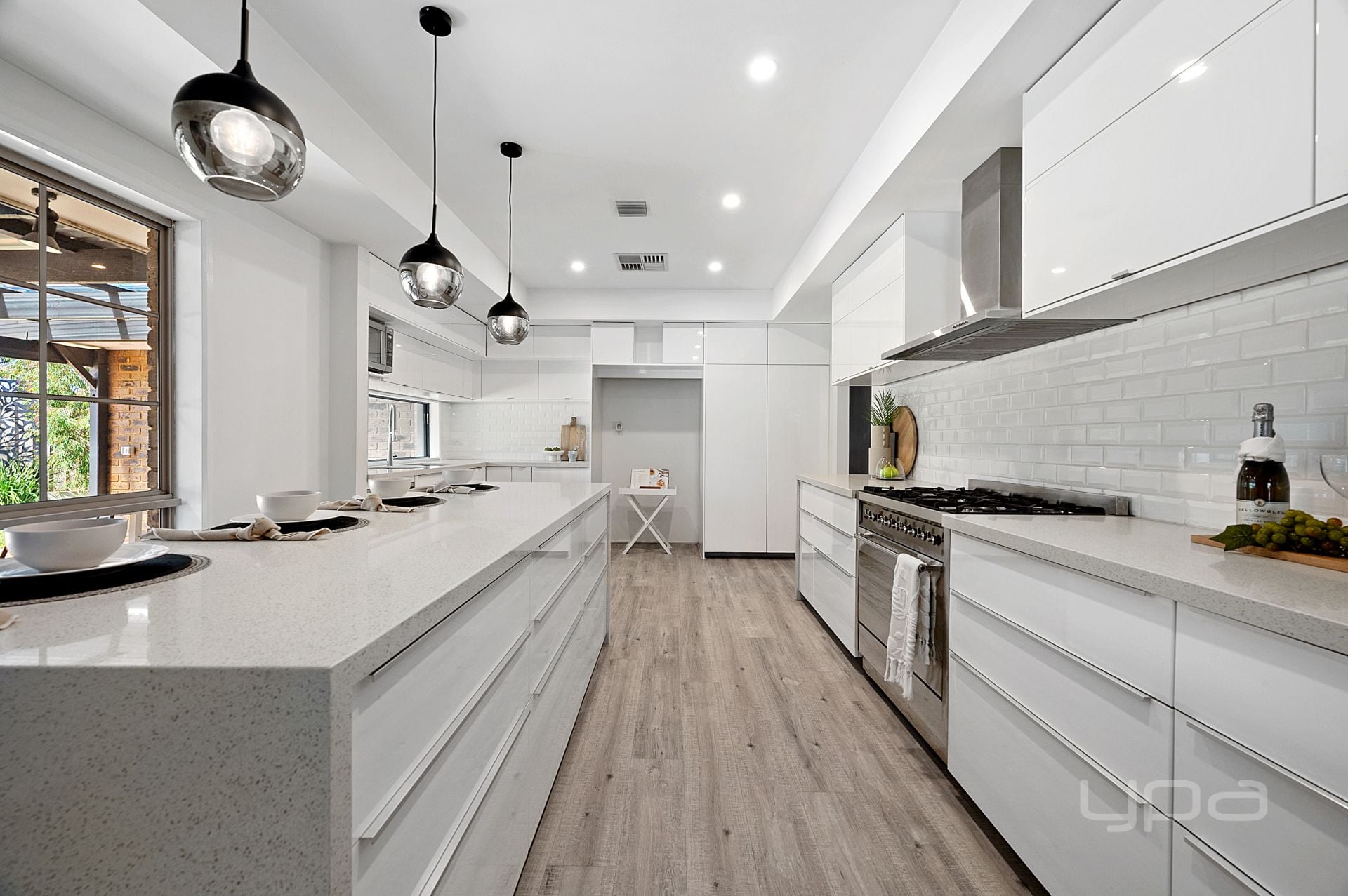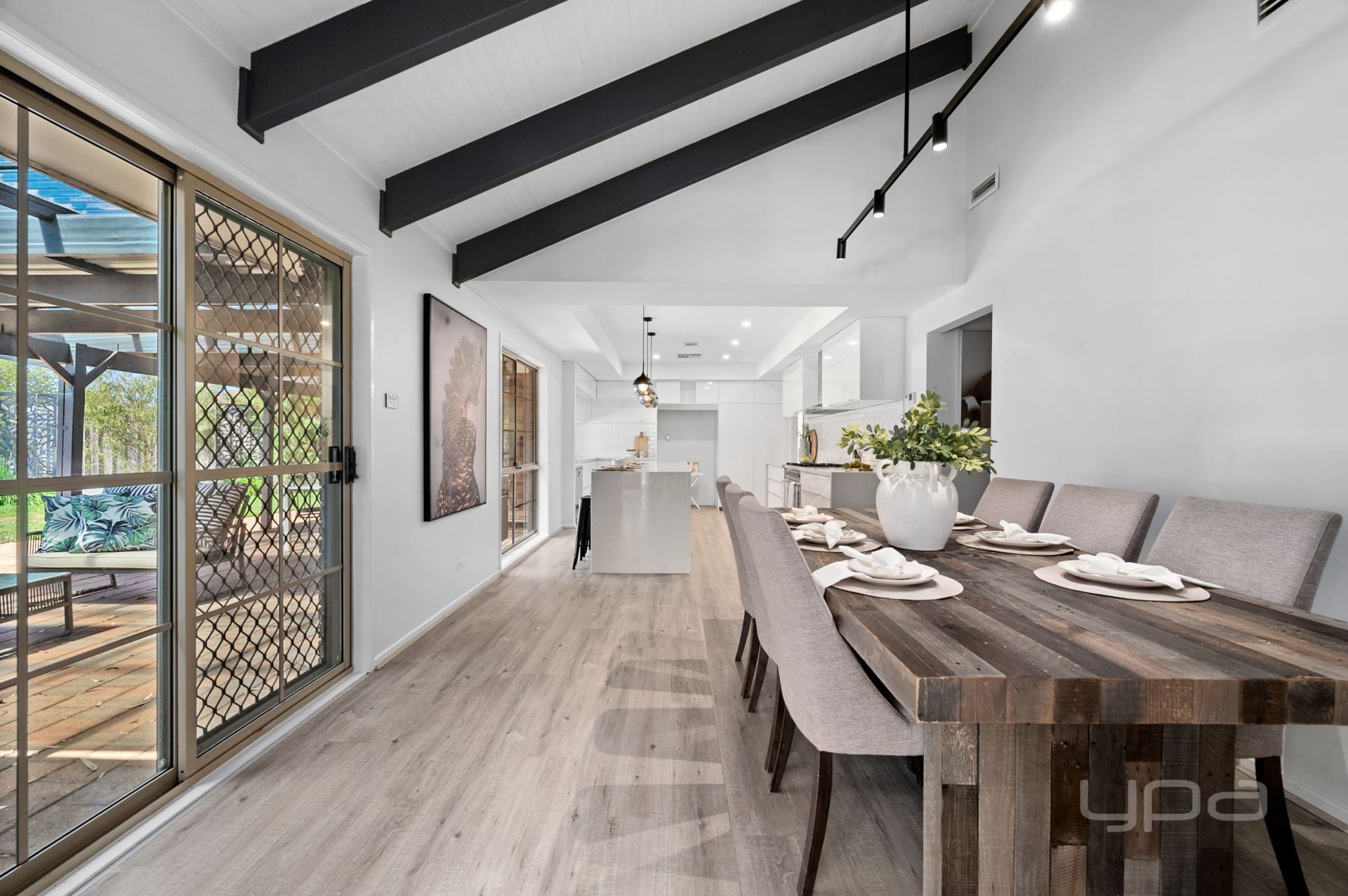 As you enter the heart of the home, the wow factoring cathedral ceilings with exposed rafters sits atop the dining room. The floating floors flow through to the jaw dropping kitchen, equipped with an abundance of stunning upgrades such as; the Smeg appliances – 900mm freestanding gas cooktop and electric oven & dishwasher, 40mm stone bench tops, upgraded cabinetry, crazy amount of bench and cupboard space, pendant lighting, undermount double sinks and a feature tiled splash back.