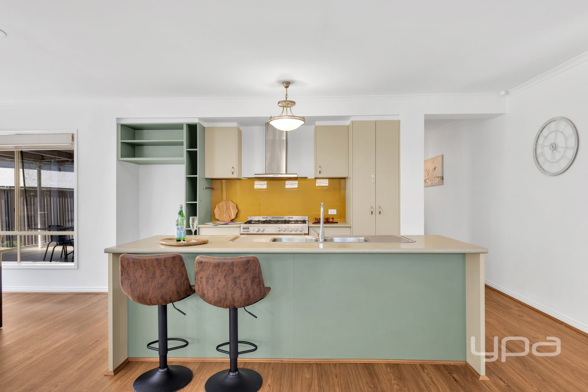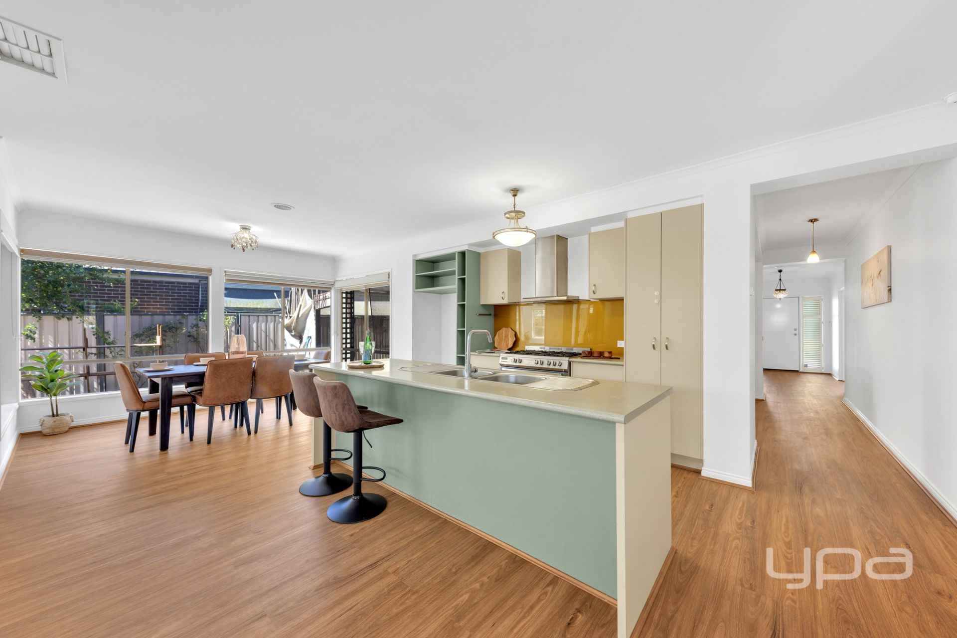 The modern kitchen is a chef's delight, complete with 900mm cooking appliances and a dishwasher, making meal preparation a breeze. Additional features include ducted heating, evaporative cooling, laminate flooring throughout, and a two-car garage with internal access, ensuring both style and practicality.