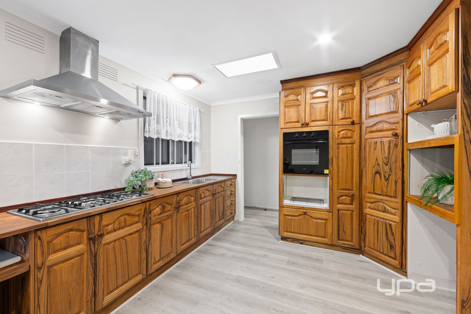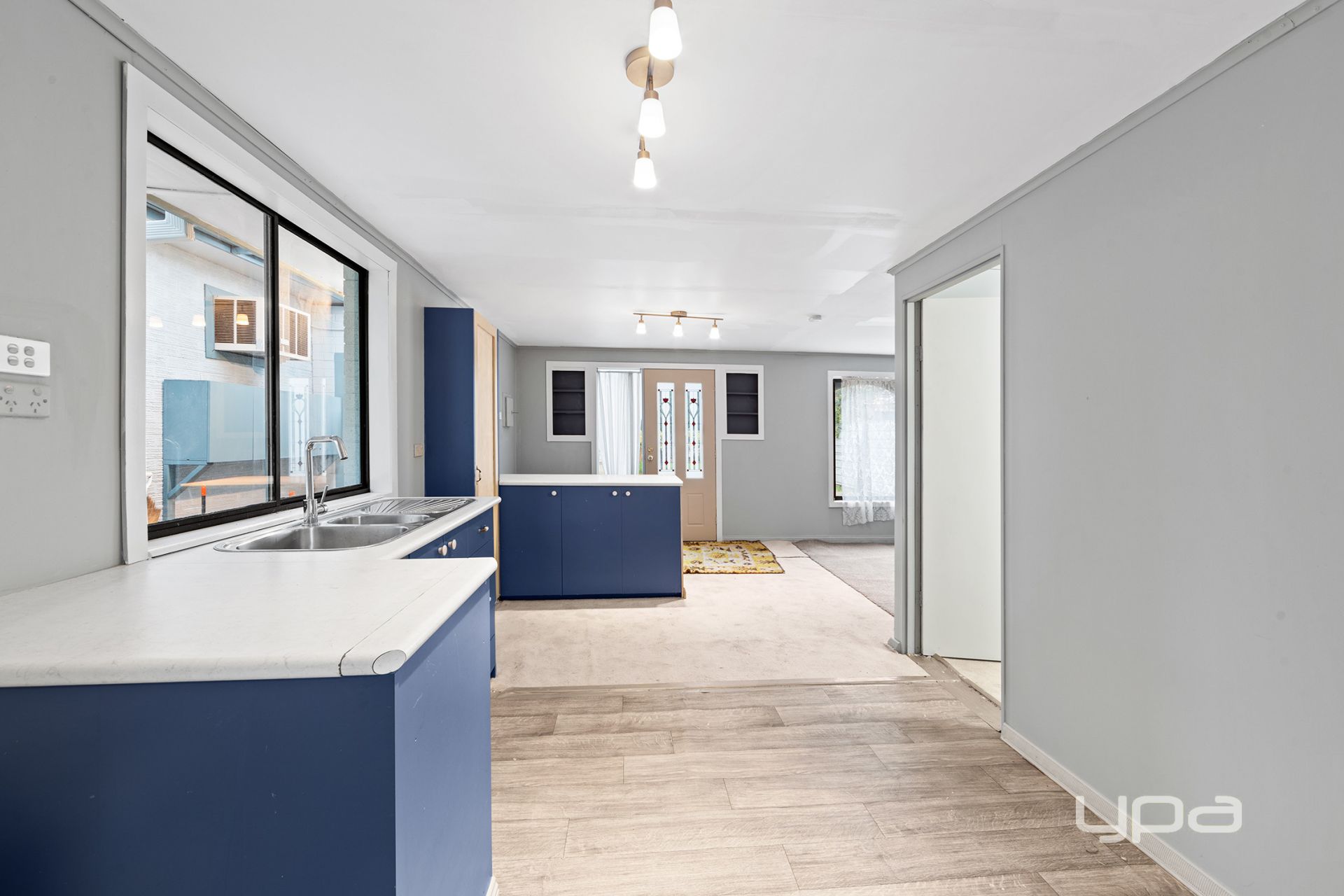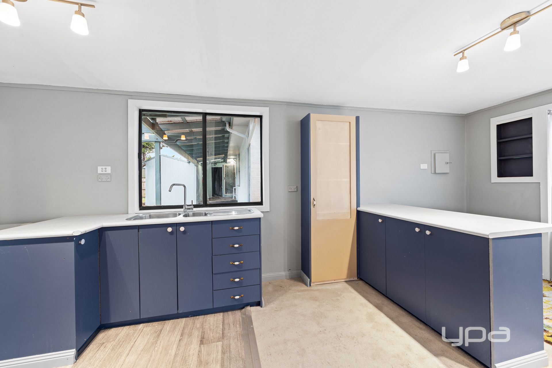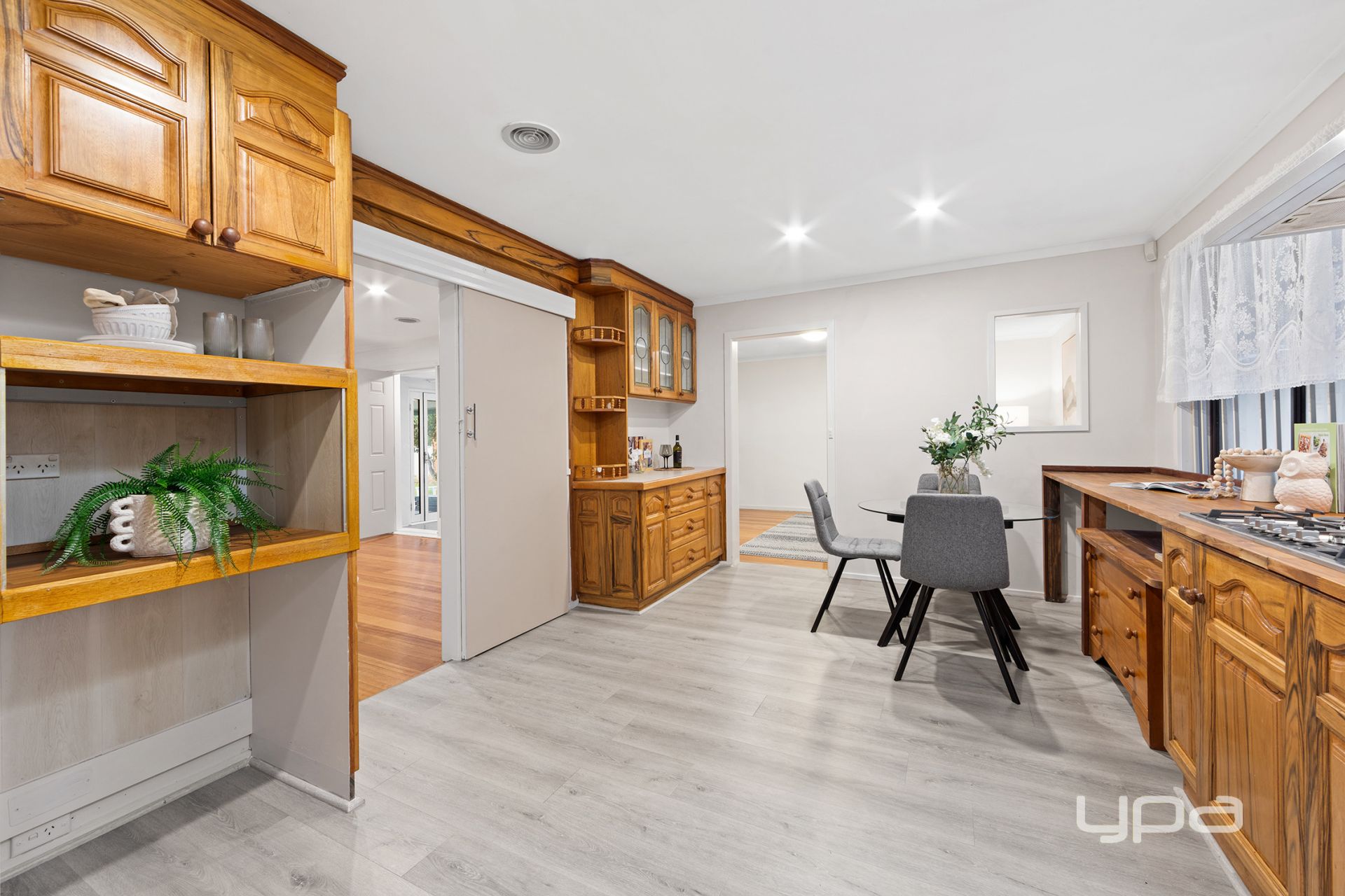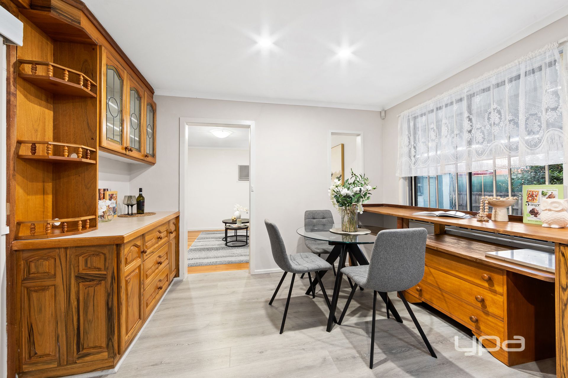 The generous living area seamlessly connects to the original timber kitchen and meals space, complete with ample cupboard storage.