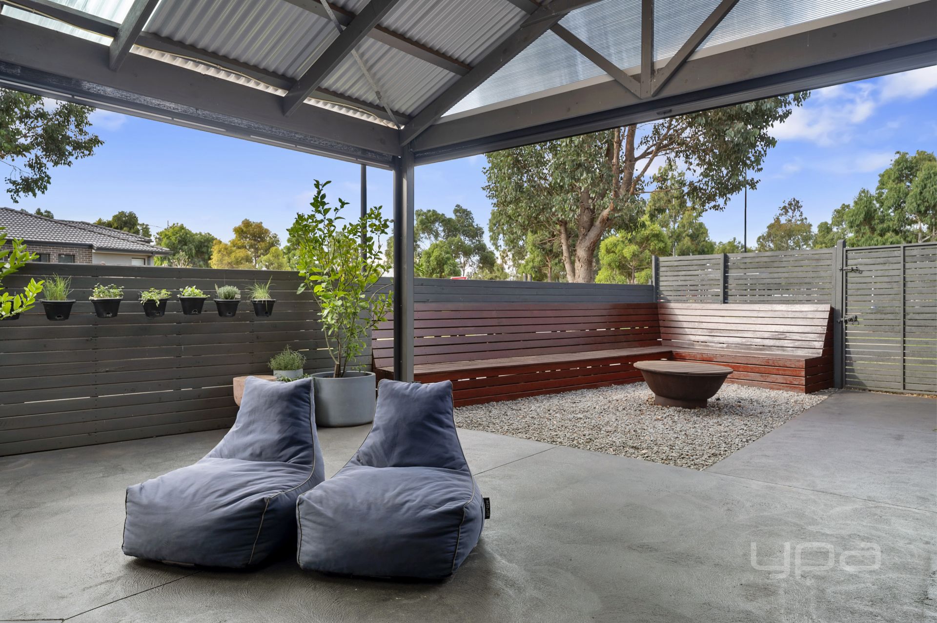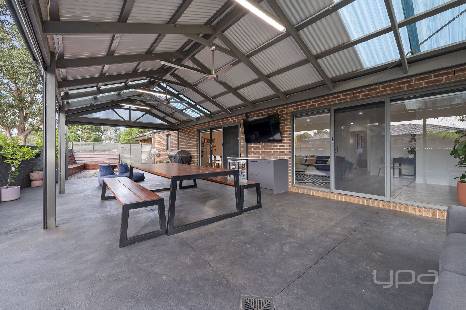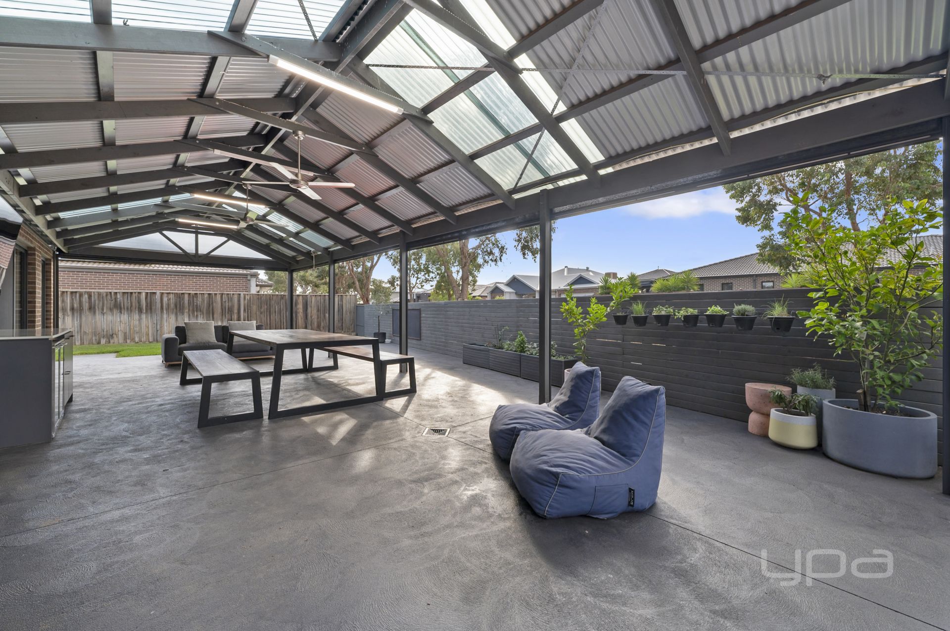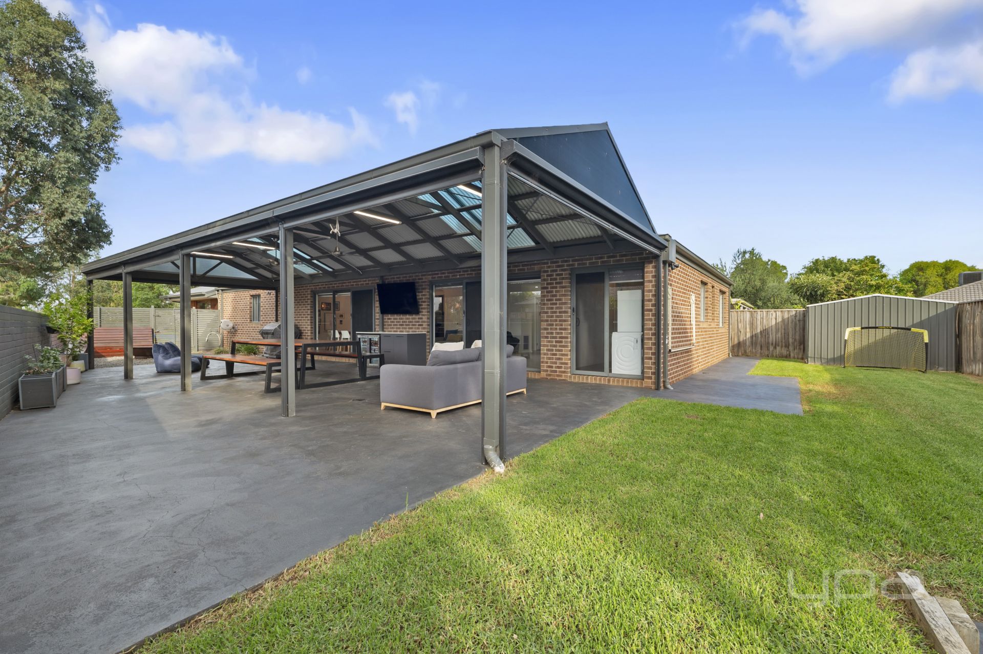 This outdoor entertaining area is sure to impress, with the huge pergola featuring built-in cabinetry, a bar fridge, blinds, and ceiling fans for year-round comfort. A dedicated outdoor dining space enhances the experience, making this home an entertainer's dream. Additional highlights include convenient side access, a garden shed, lush manicured lawn, a concrete perimeter, and a designated fire pit area with built-in timber seating.