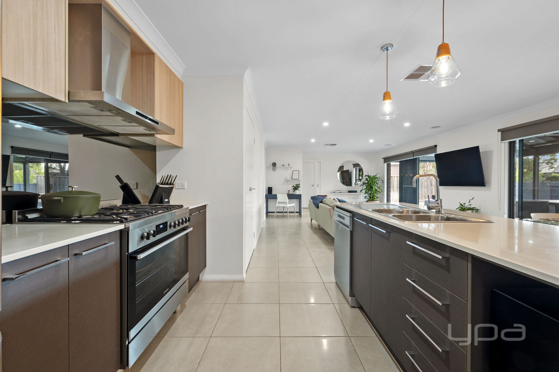 At the centre of the home is the beautifully designed kitchen, living, and meals area, seamlessly blending style and functionality. The kitchen boasts a sleek design with a 900mm cooktop and oven, dishwasher, elegant pendant lighting, spacious island bench with stone benchtop, built-in pantry, and ample storage. The light-filled open floor plan effortlessly connects the kitchen to the dining area and a generous living space, complemented by a dedicated study nook. The large sliding doors open to the sensational backyard, offering perfect indoor-outdoor living experience.