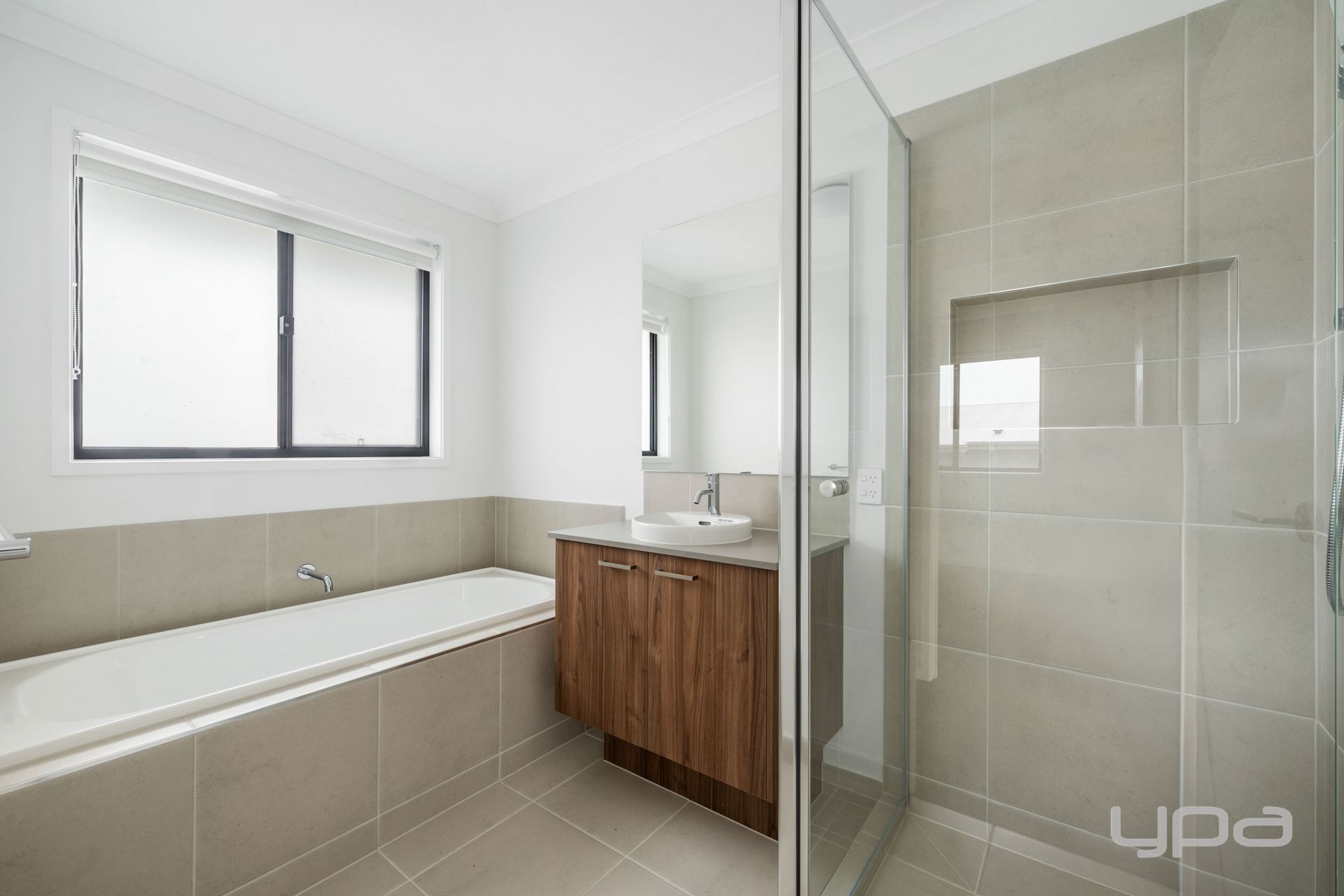 • Central bathroom with bathtub, shower, stone bench top and quality fittings