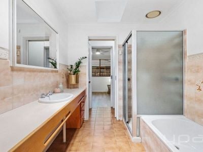 Central bathroom, featuring separate shower, and bath - and walk through access to bedroom. Low maintenance, private courtyard.