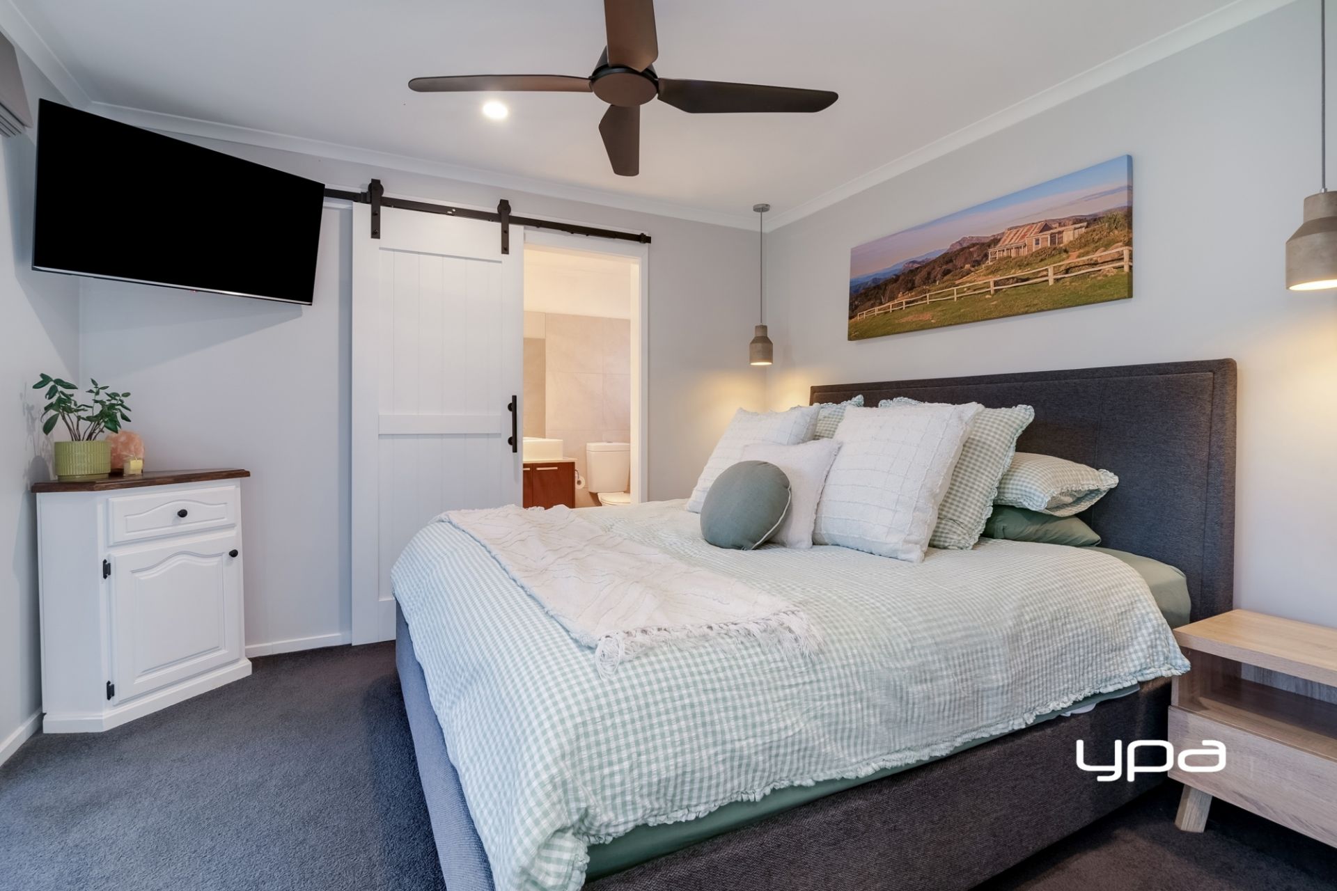 At the front of the home, the master bedroom offers a peaceful retreat with a walk-in robe, ceiling fan, and a stylish ensuite featuring a double vanity and large shower. Two additional bedrooms are fitted with built-in robes and are serviced by a central bathroom with a separate toilet.