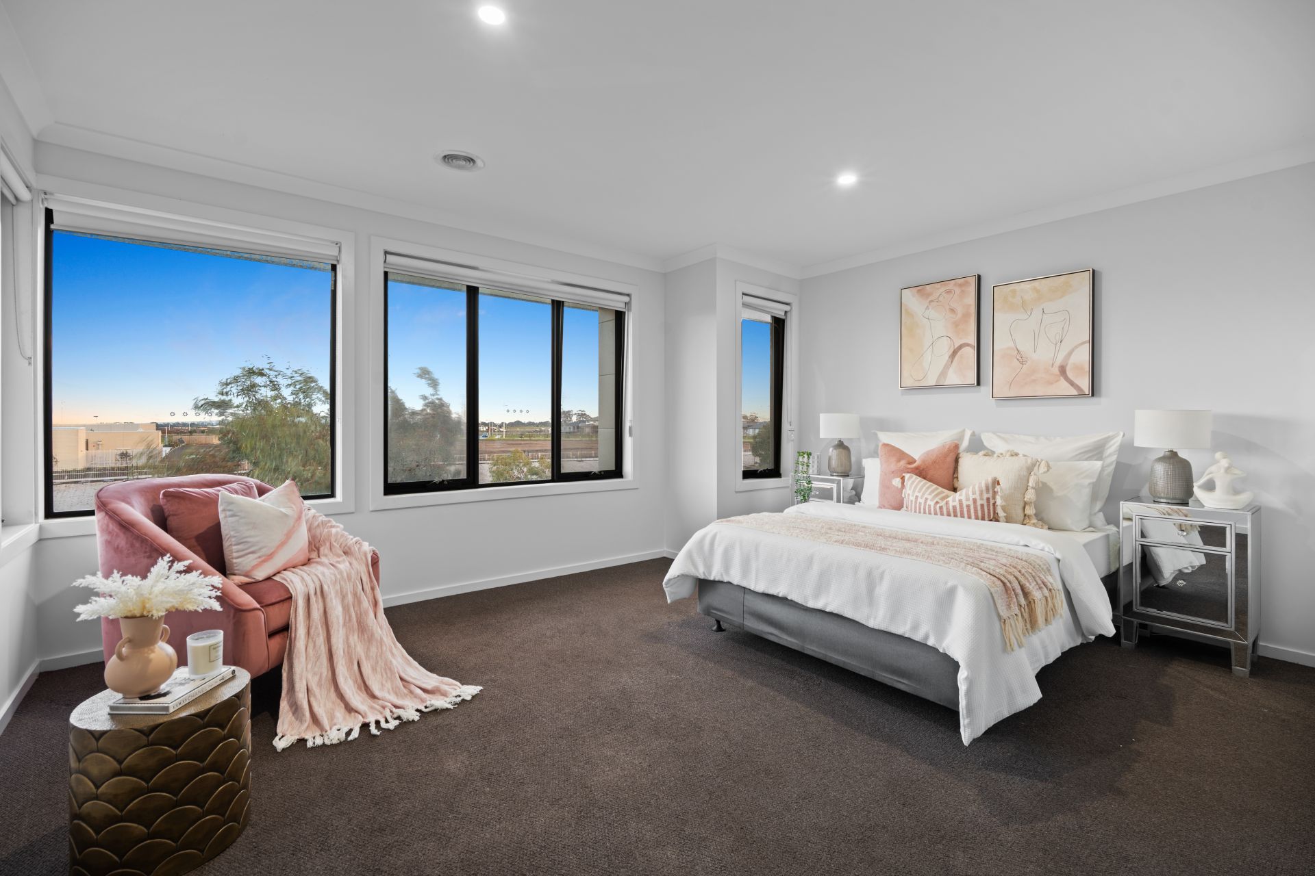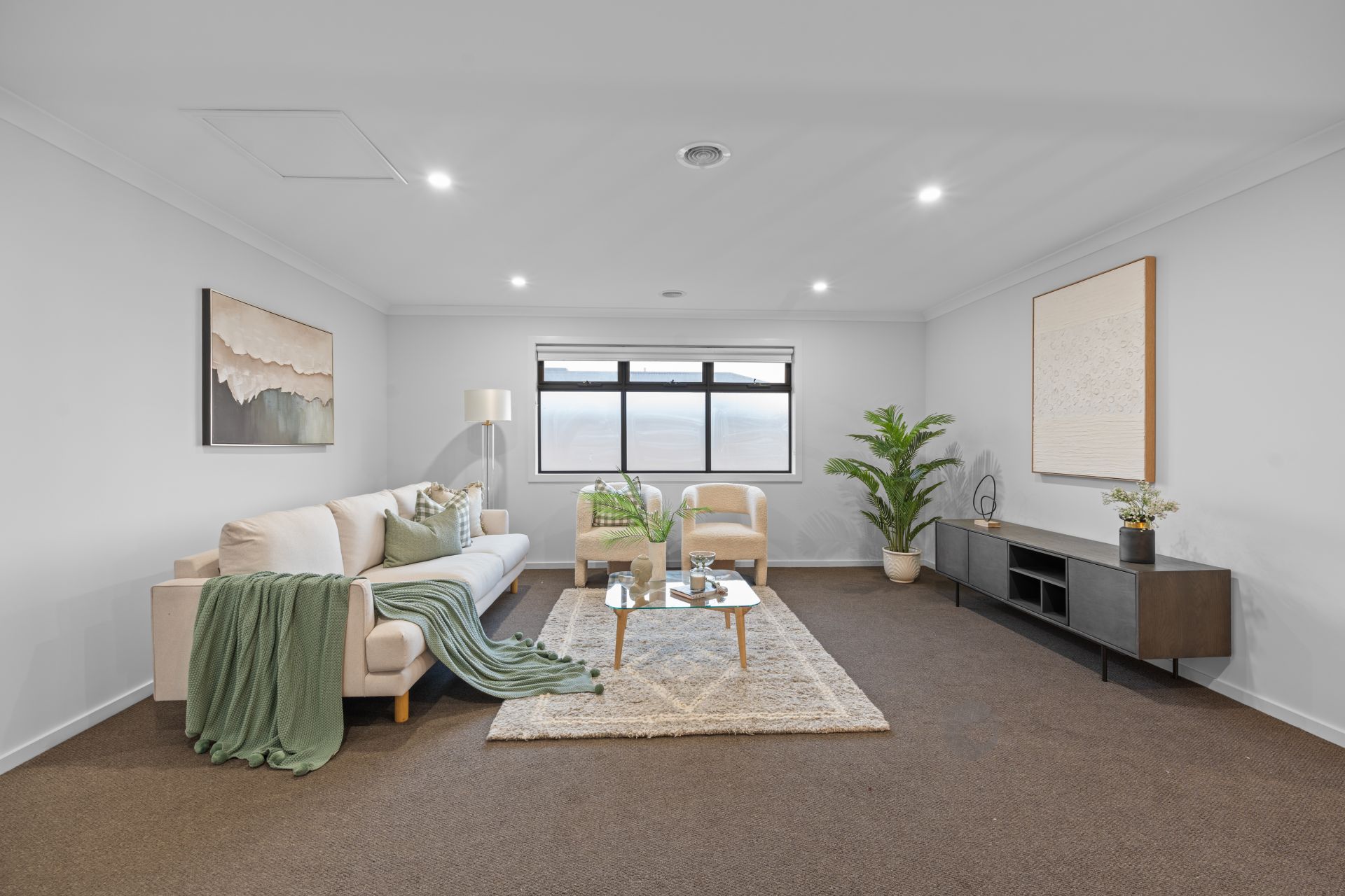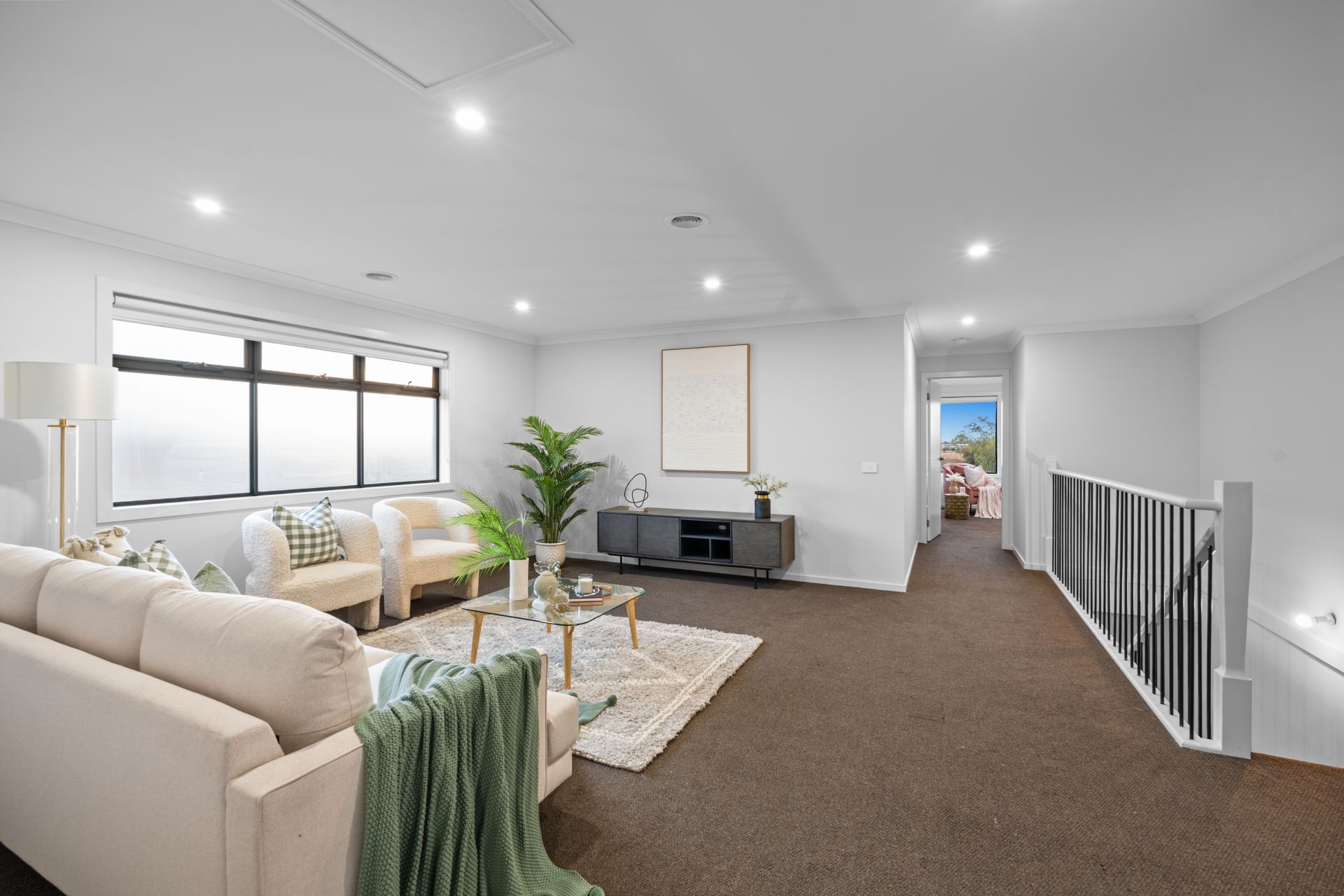 Additional living areas include a light-filled formal lounge and an expansive upstairs retreat, providing multiple zones for both relaxation and entertainment. A fully carpeted staircase with floating treads adds a striking architectural element, while luxury window furnishings and extra heavy-duty carpet with premium underlay further enhance the interior comfort.