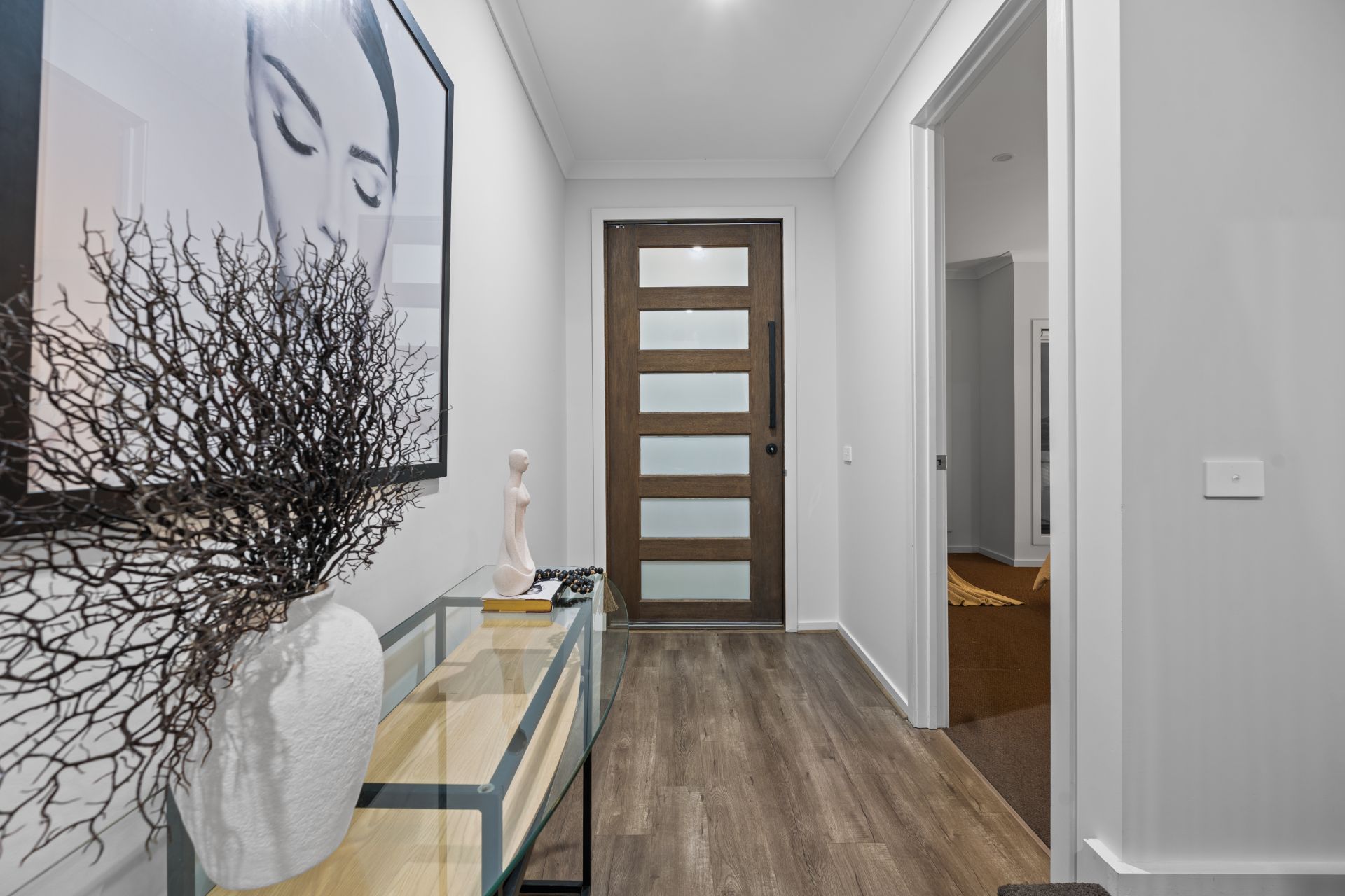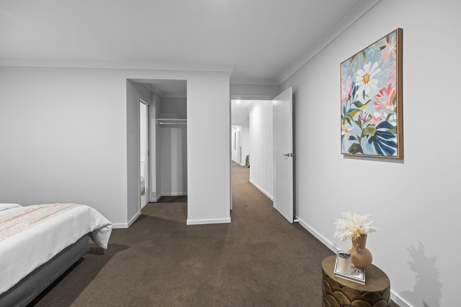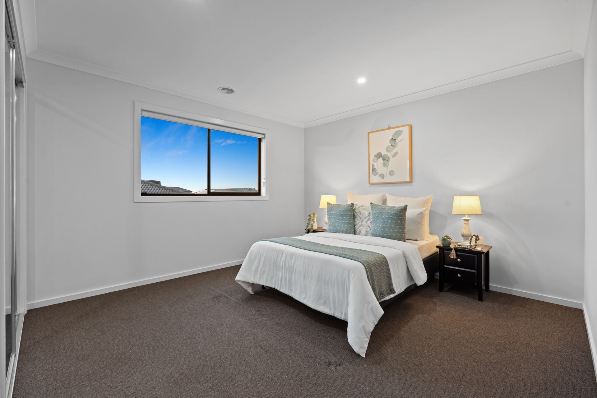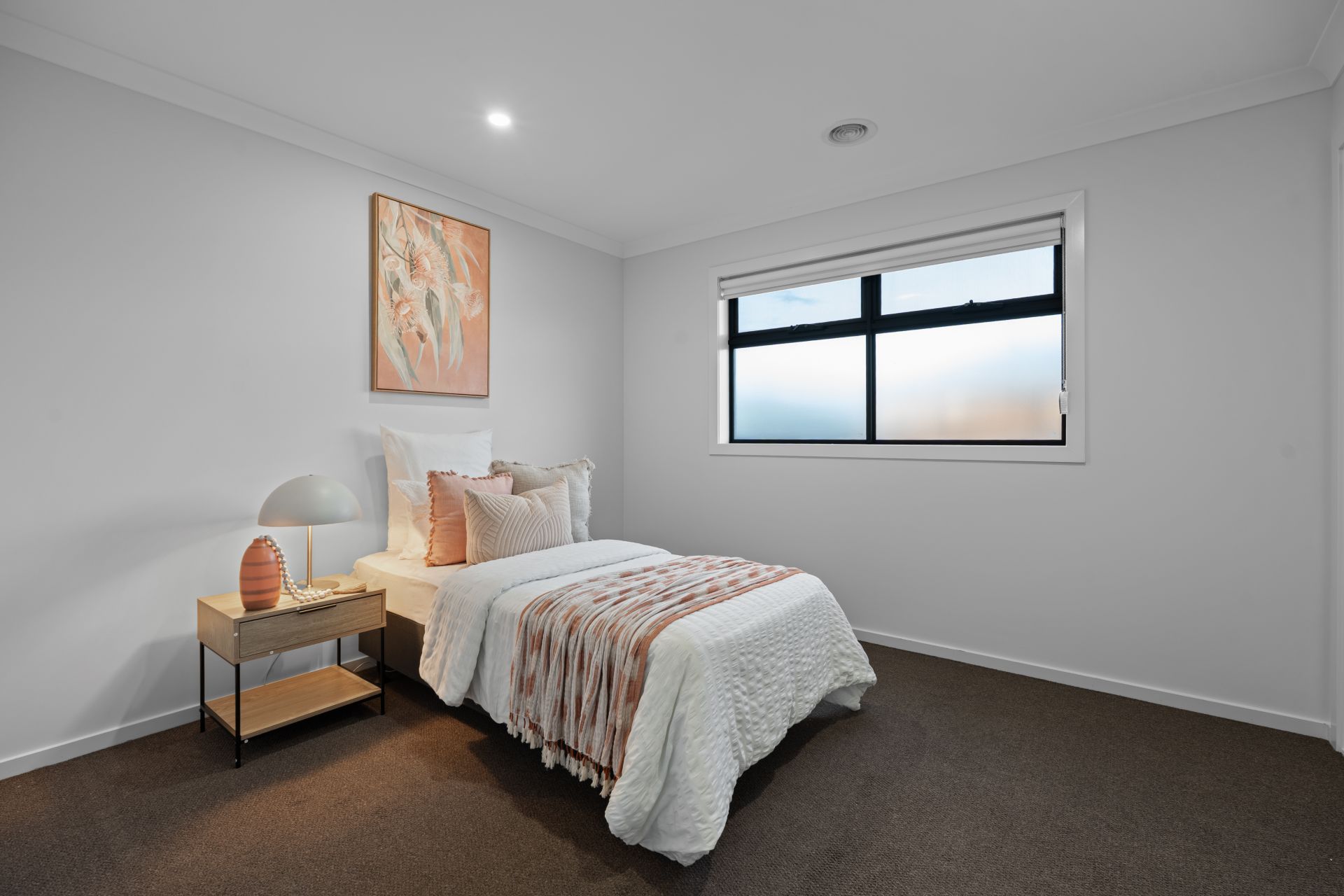 Additional living areas include a light-filled formal lounge and an expansive upstairs retreat, providing multiple zones for both relaxation and entertainment. A fully carpeted staircase with floating treads adds a striking architectural element, while luxury window furnishings and extra heavy-duty carpet with premium underlay further enhance the interior comfort.