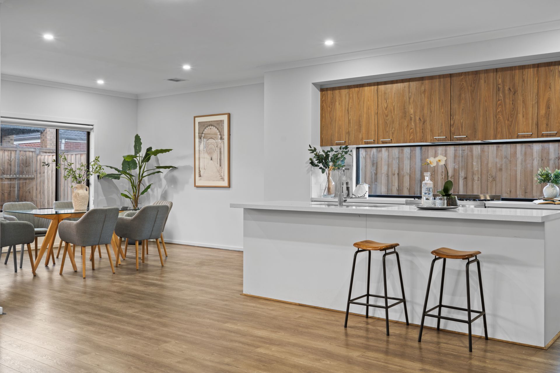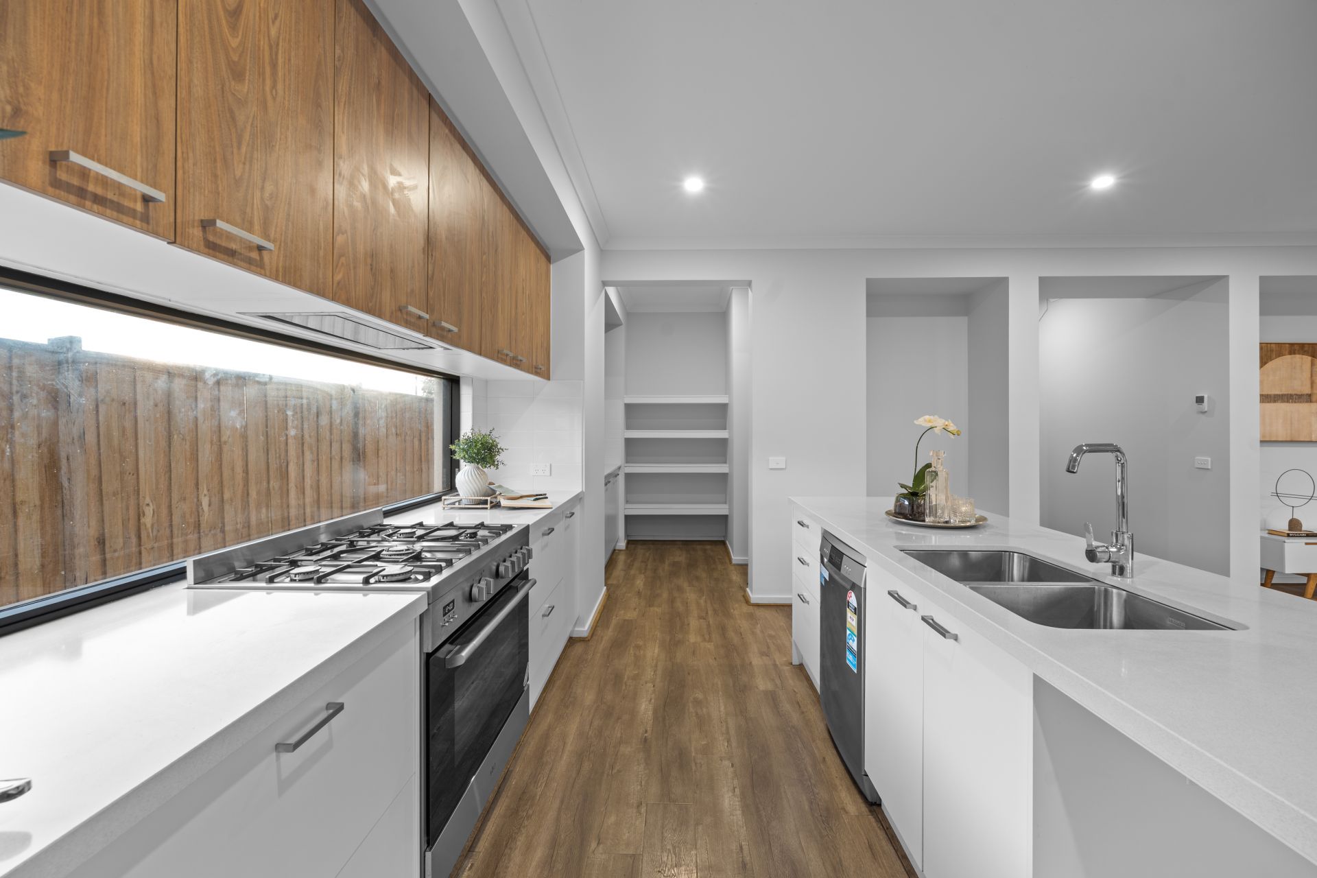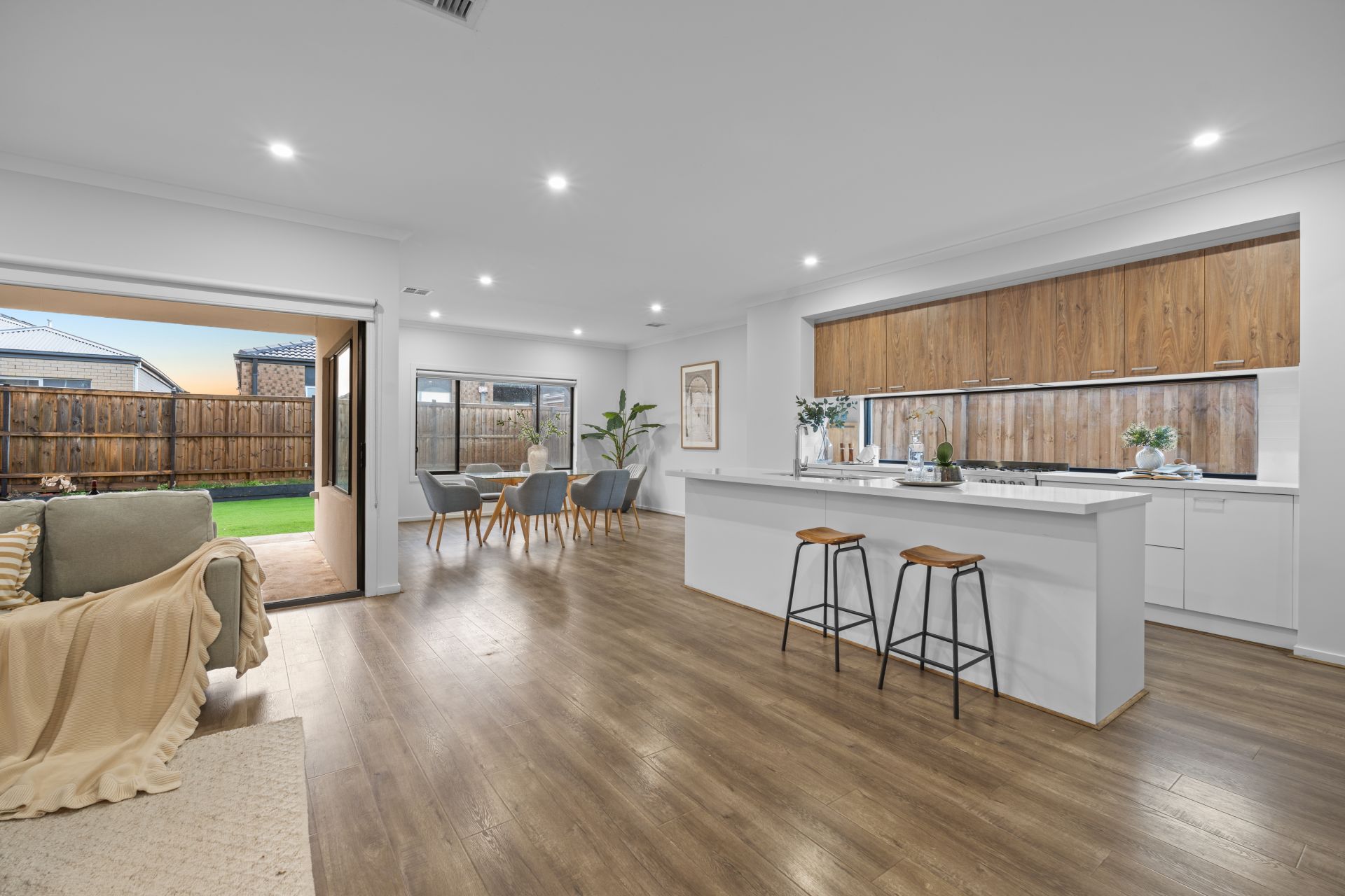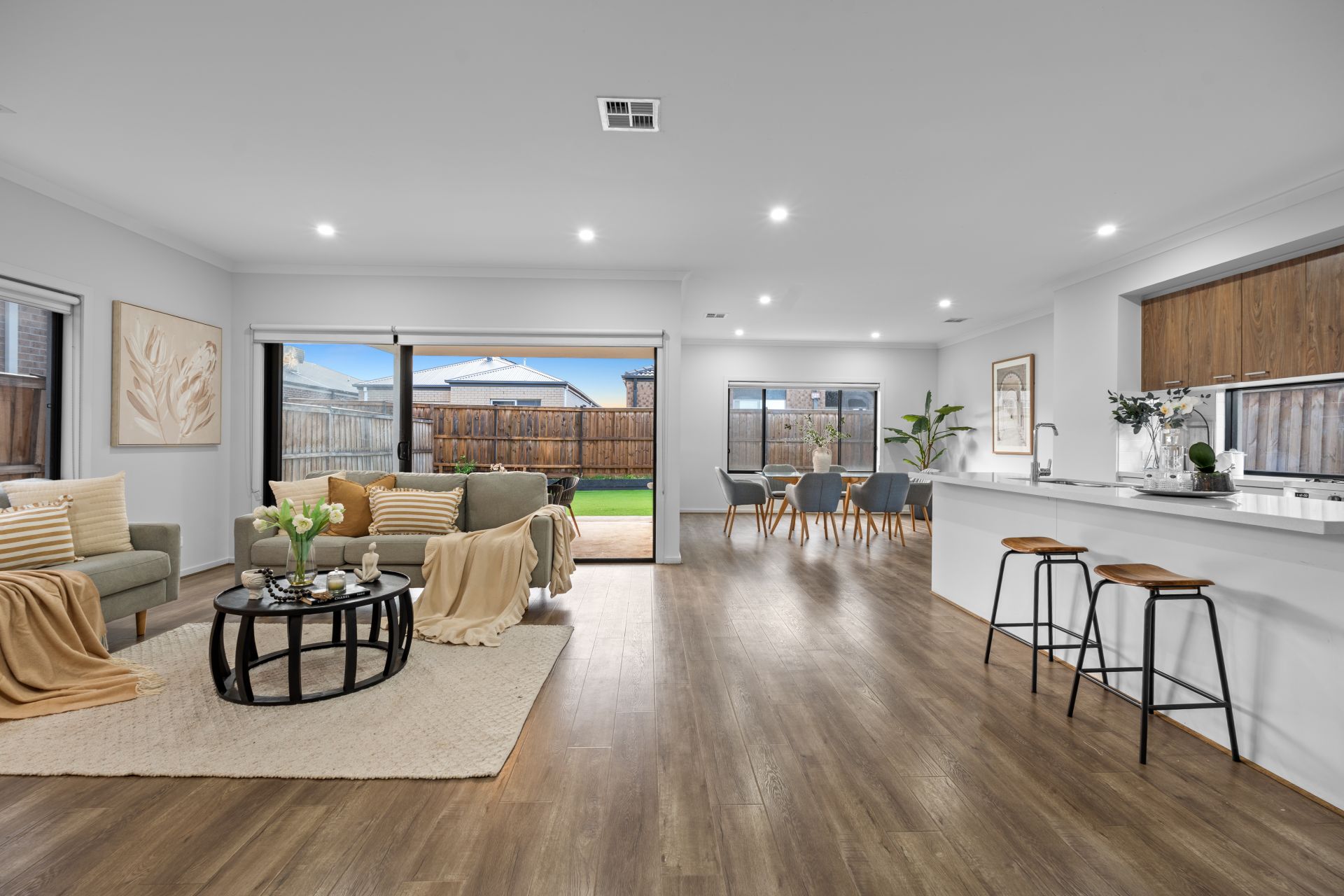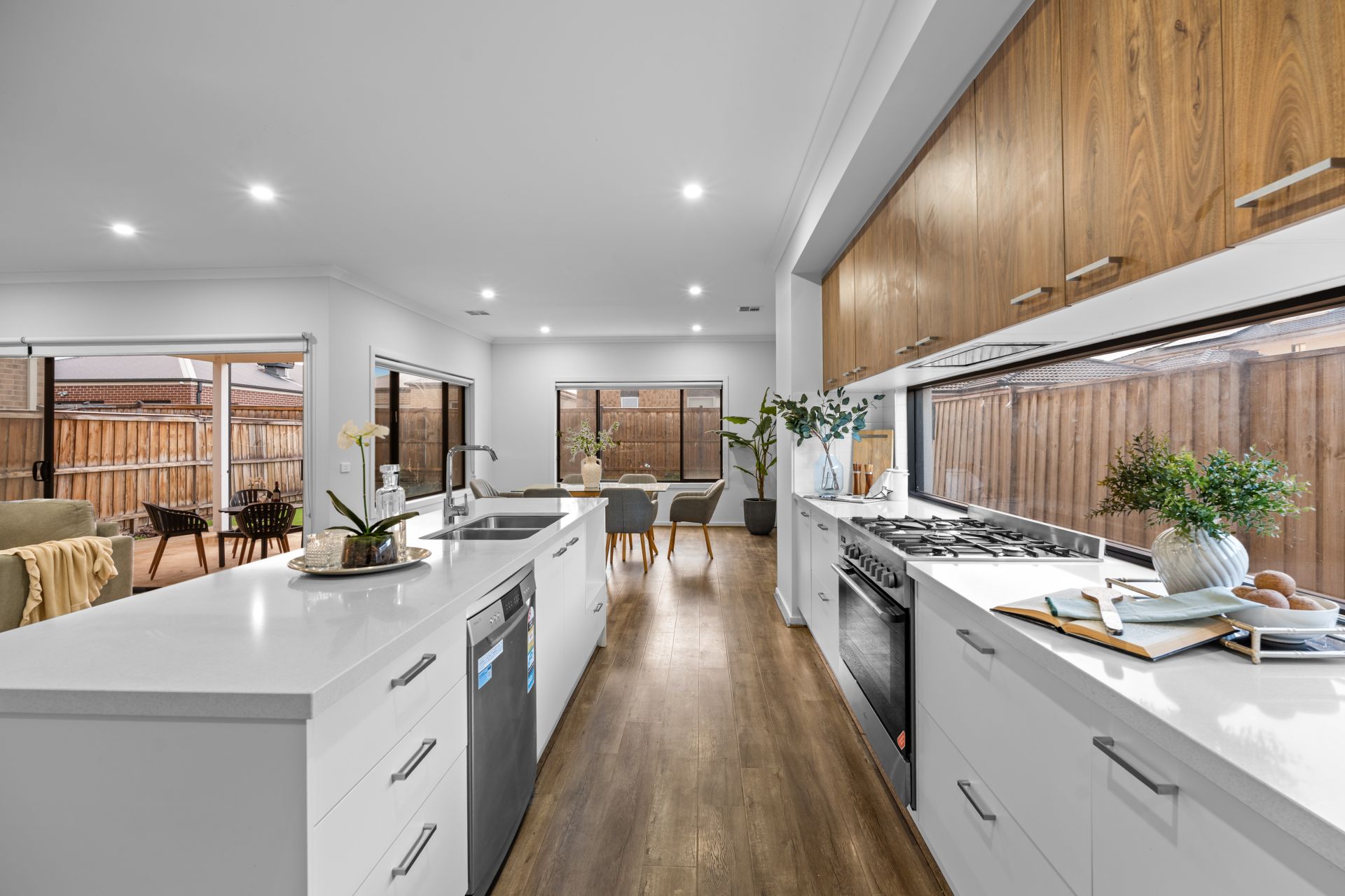 The heart of the home is the modern open-plan kitchen, which features 900mm European stainless-steel appliances, a 40mm stone benchtop, glass splashback, large walk-in pantry, dishwasher, and an abundance of storage. The kitchen seamlessly overlooks a spacious meals and living zone that opens out to a stunning fully decked alfresco area—perfect for entertaining guests or enjoying a relaxed evening with family.