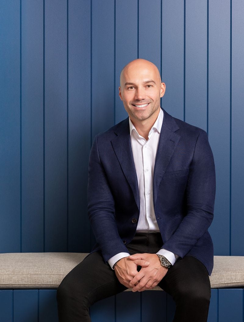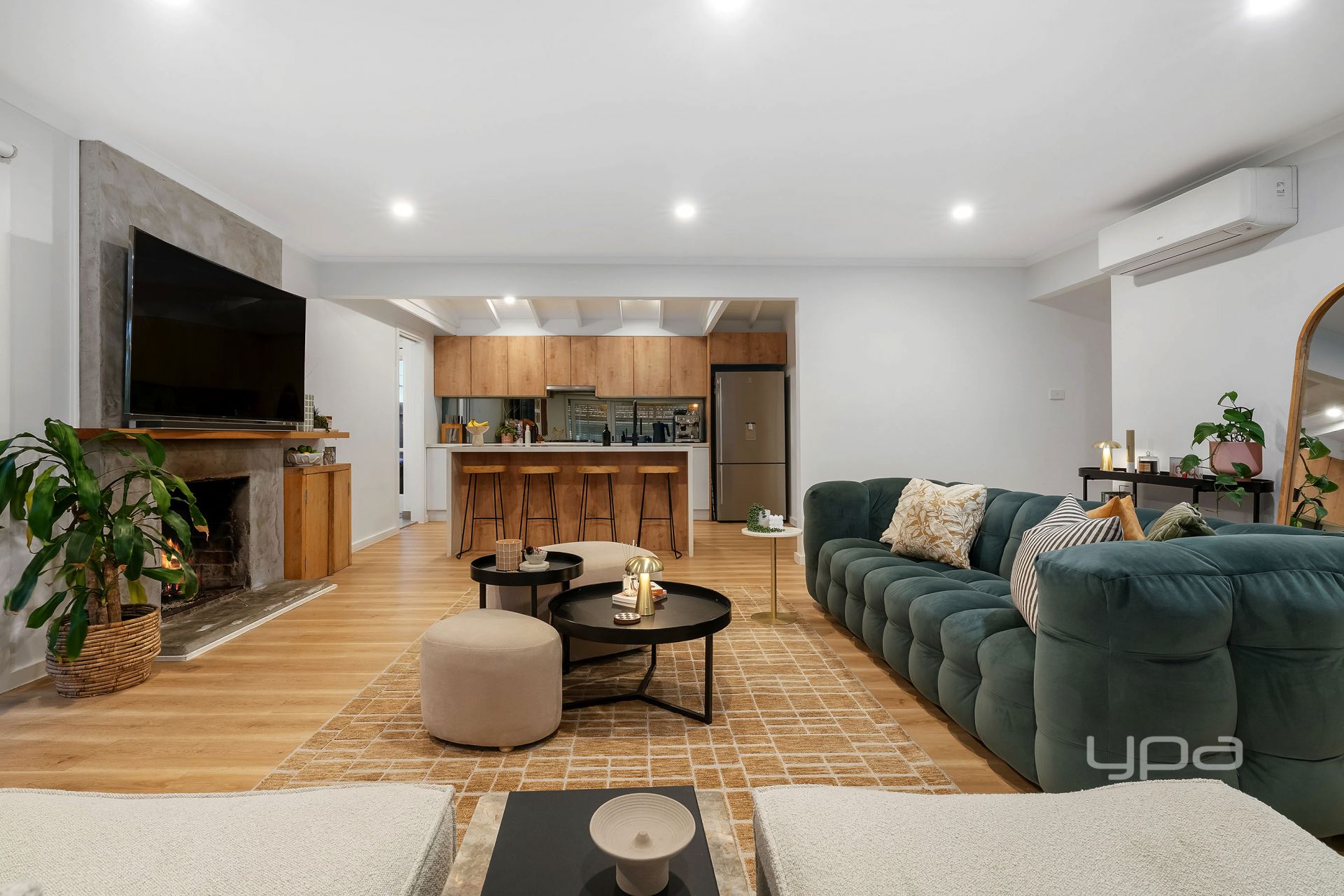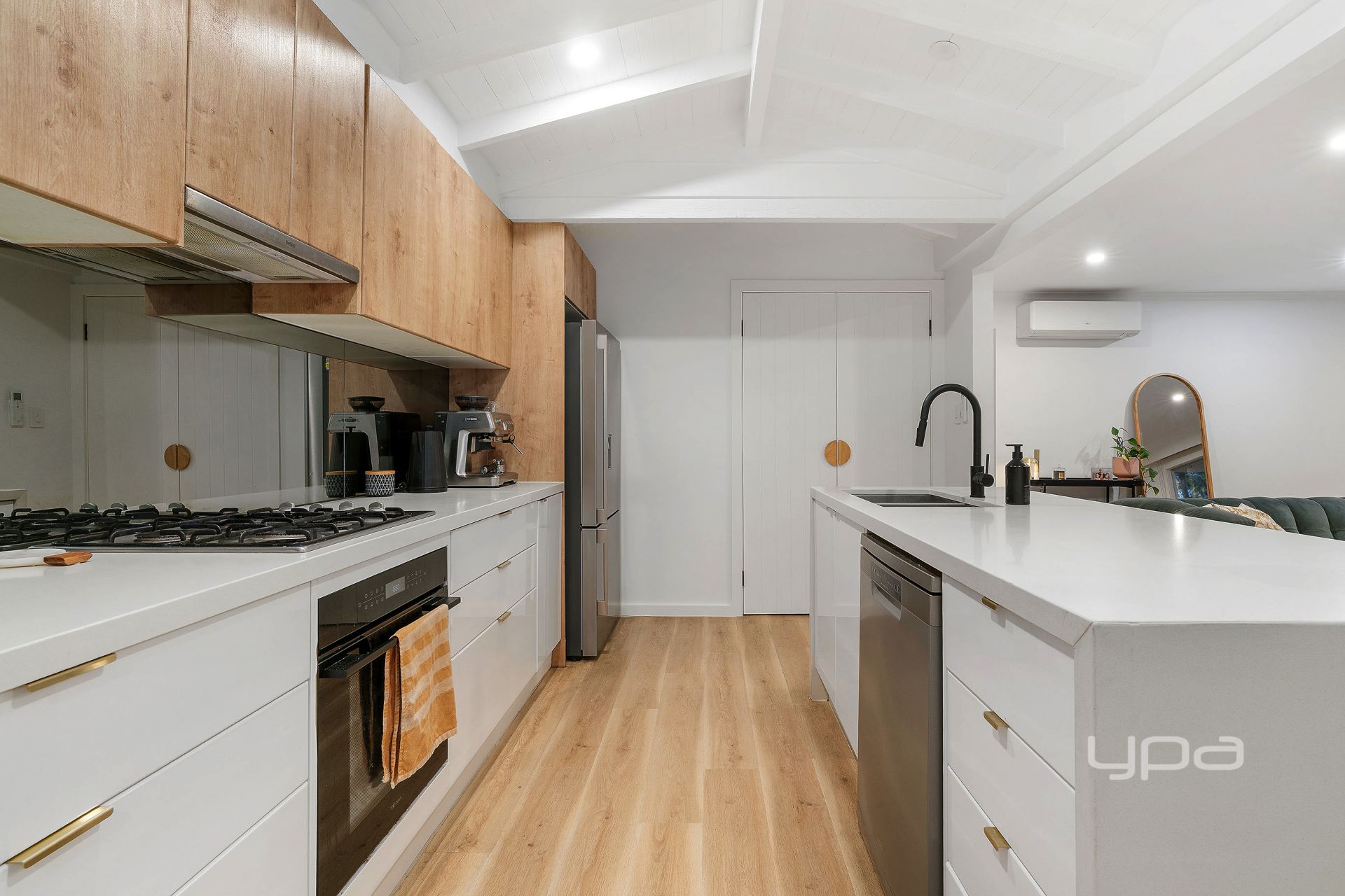 Underpinned by timber flooring, the family space intuitively unites conversation at the home's meeting point. Comprising stone benchtops, a spacious island bench, a gas stove, and the home's signature gold-toned accents, the kitchen allows food preparation to overlook an open fireplace in the living space, extending views through to the private alfresco.