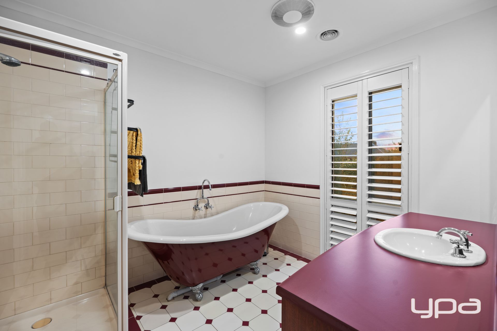 Upstairs, a grand timber staircase leads to three spacious bedrooms. The master suite offers a built-in robe and a beautifully appointed ensuite, while the remaining bedrooms — both with ceiling fans and built-in robes — share a luxurious central bathroom with deep soaking tub, vanity, and elegant finishes.