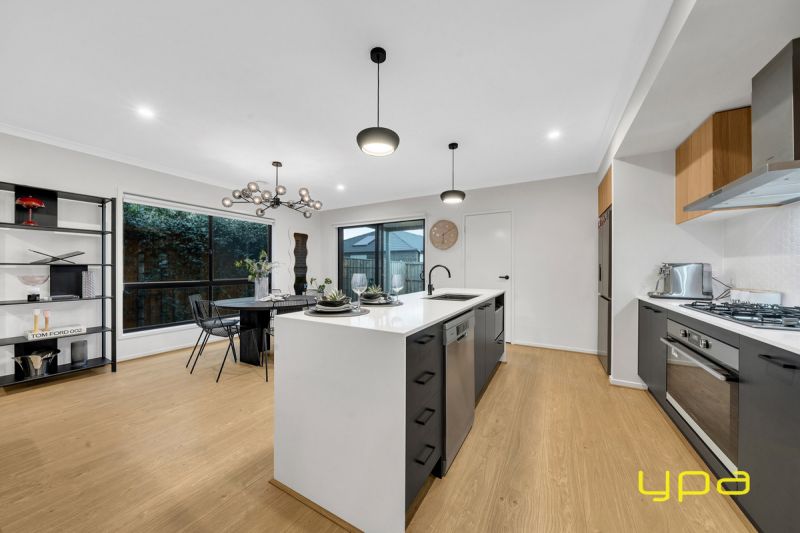 At the heart of the home lies a breathtaking modern kitchen, featuring a stone benchtop with elegant waterfall edges and surrounded by highlight windows that bathe the space in natural light. This spectacular centrepiece enhances the open-plan layout, perfectly complementing the warm, inviting living and dining areas. With a 900mm oven and stovetop, the gourmet kitchen is ideal for both family meals and effortless entertaining.