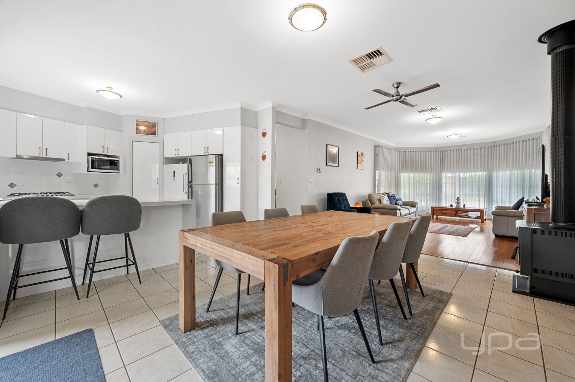 Moving through the home, you'll discover the renovated kitchen, boasting 40mm stone benches with waterfall finishes, bigger gas cooktop and electric oven, plenty of bench and cupboard space and a dishwasher. The stunning kitchen over the looks the everyday lounge and dining space, while still being large in size and also has the sheer blinds and is enhanced by the Conara fireplace and ceiling fan, ensuring the space is comfortable all year round!