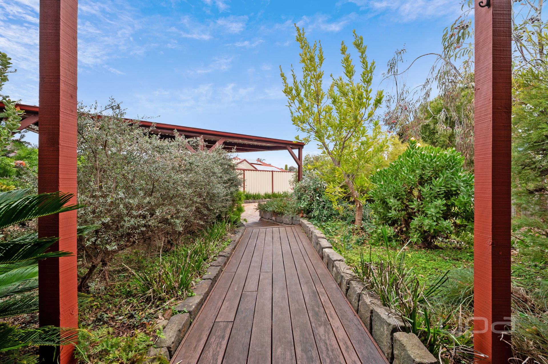 Around the corner you are met with a small pond that is absolutely calming to sit around while the space also features soft, carpet like Mondo grass which never needs to be mowed, alongside a large Lemon scented gum, which is a stunning tree imported from Queensland known for its stunning appearance, gorgeous flowering in the summer and strong branches that don't typically break or require much maintenance at all. The pond also has species of local native minnows and shrimp as well as many species of frog including Banjo frogs, Peron's tree frogs and Growling grass frogs which keep the mossies down. (Please do not add goldfish)