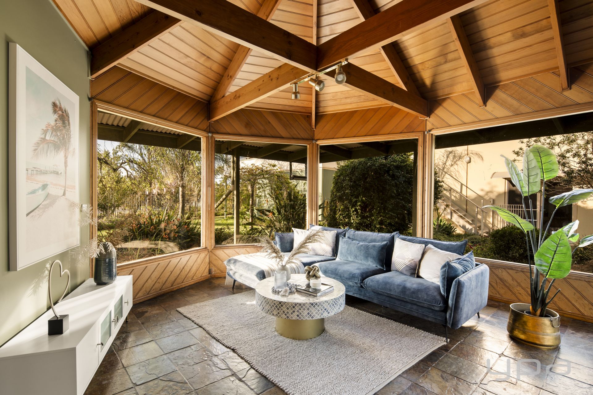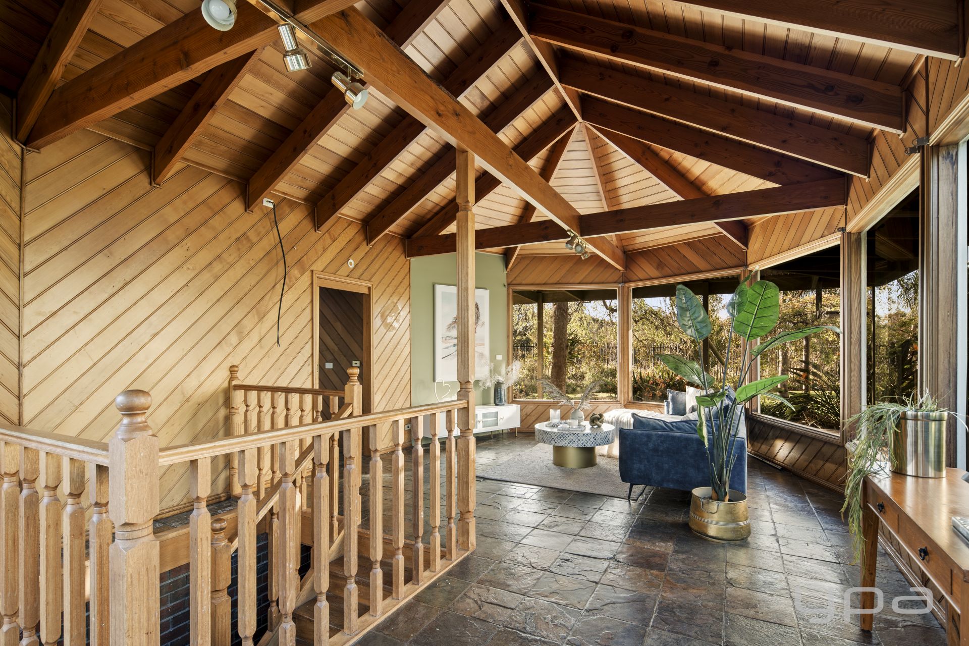 -Multiple skylights and large windows framing leafy views