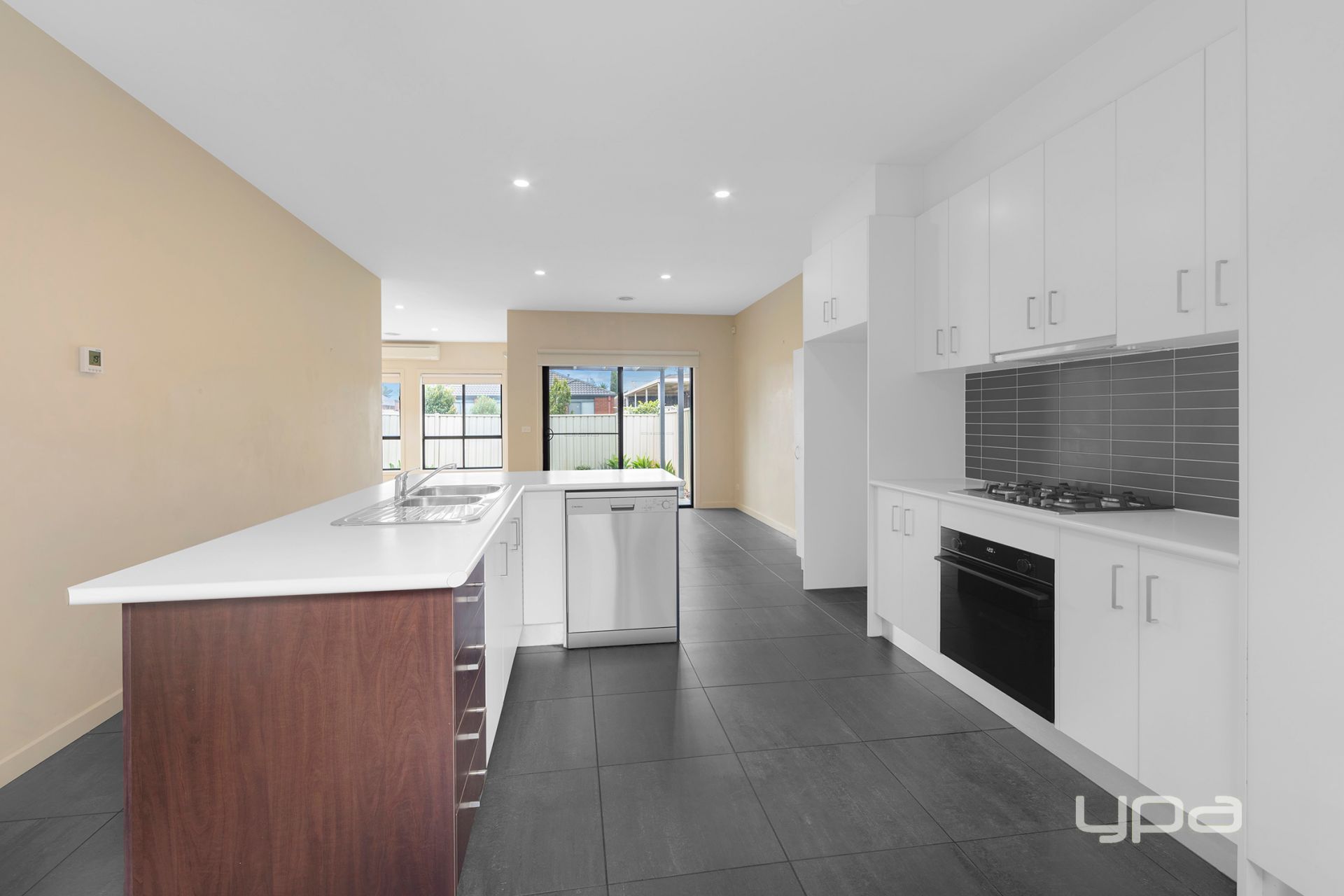 The modern kitchen boasts stainless steel appliances, including a dishwasher, ample bench space, and generous storage options.
