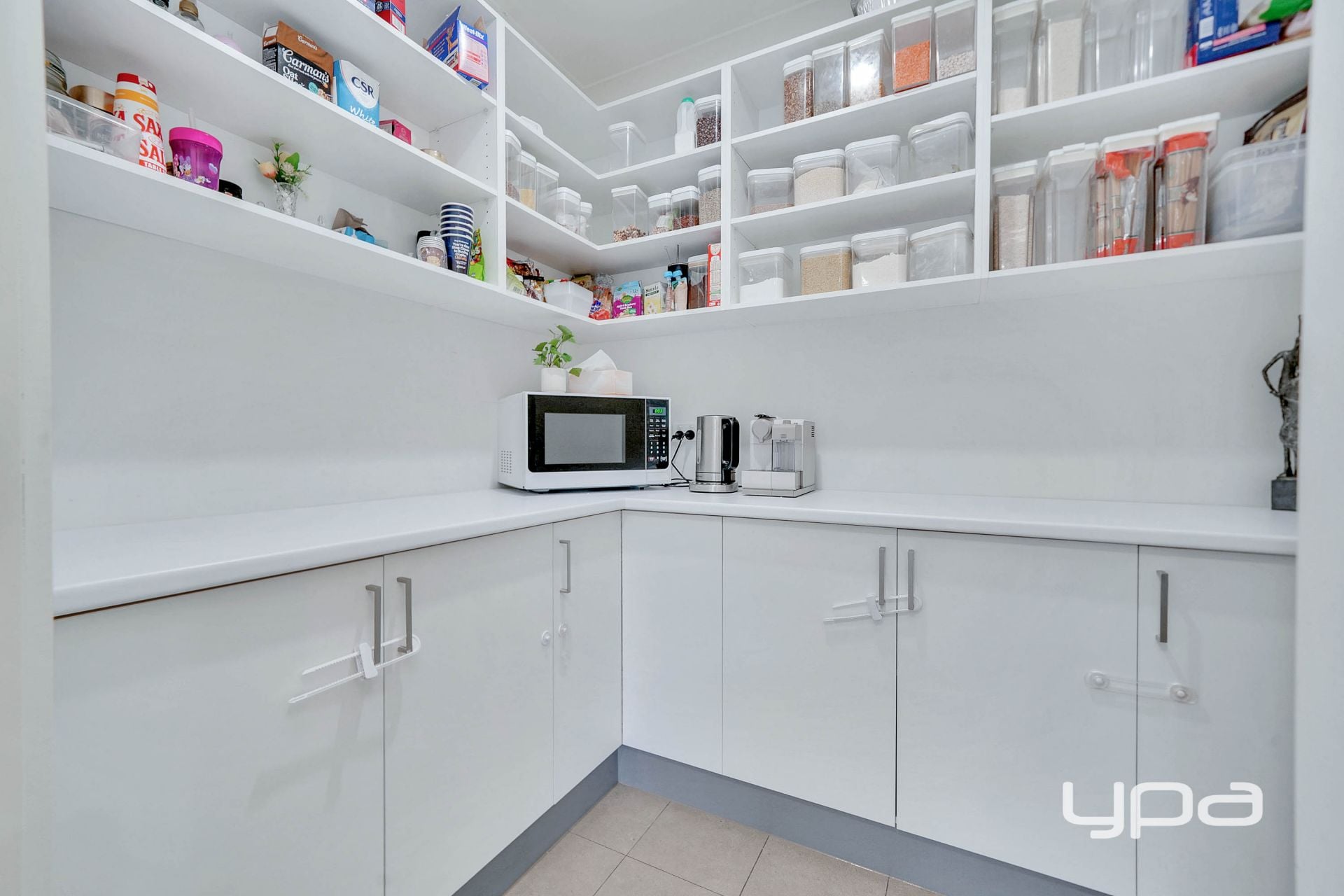 • Designer kitchen with stone benchtops, stainless-steel appliances, and oversized butler's pantry